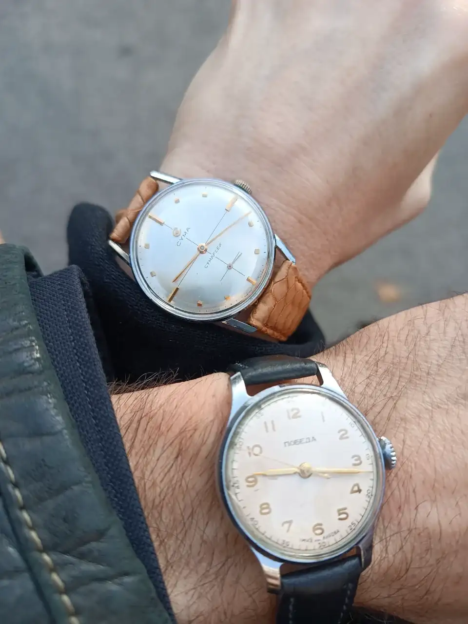 Mi compañera con un Cyma y yo con un Pobeda.