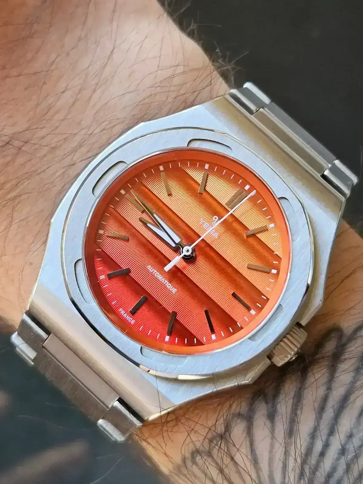 Seguimos con el viajero. Un dial con muchos matices, iridescente creo que es la palabra. Me gusta esto de un reloj CUCO con brazalete integrado y es comodísimo