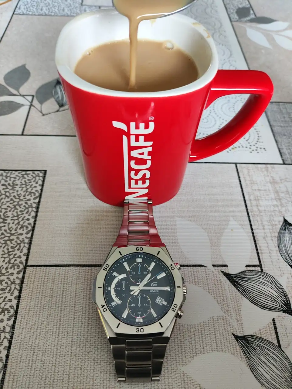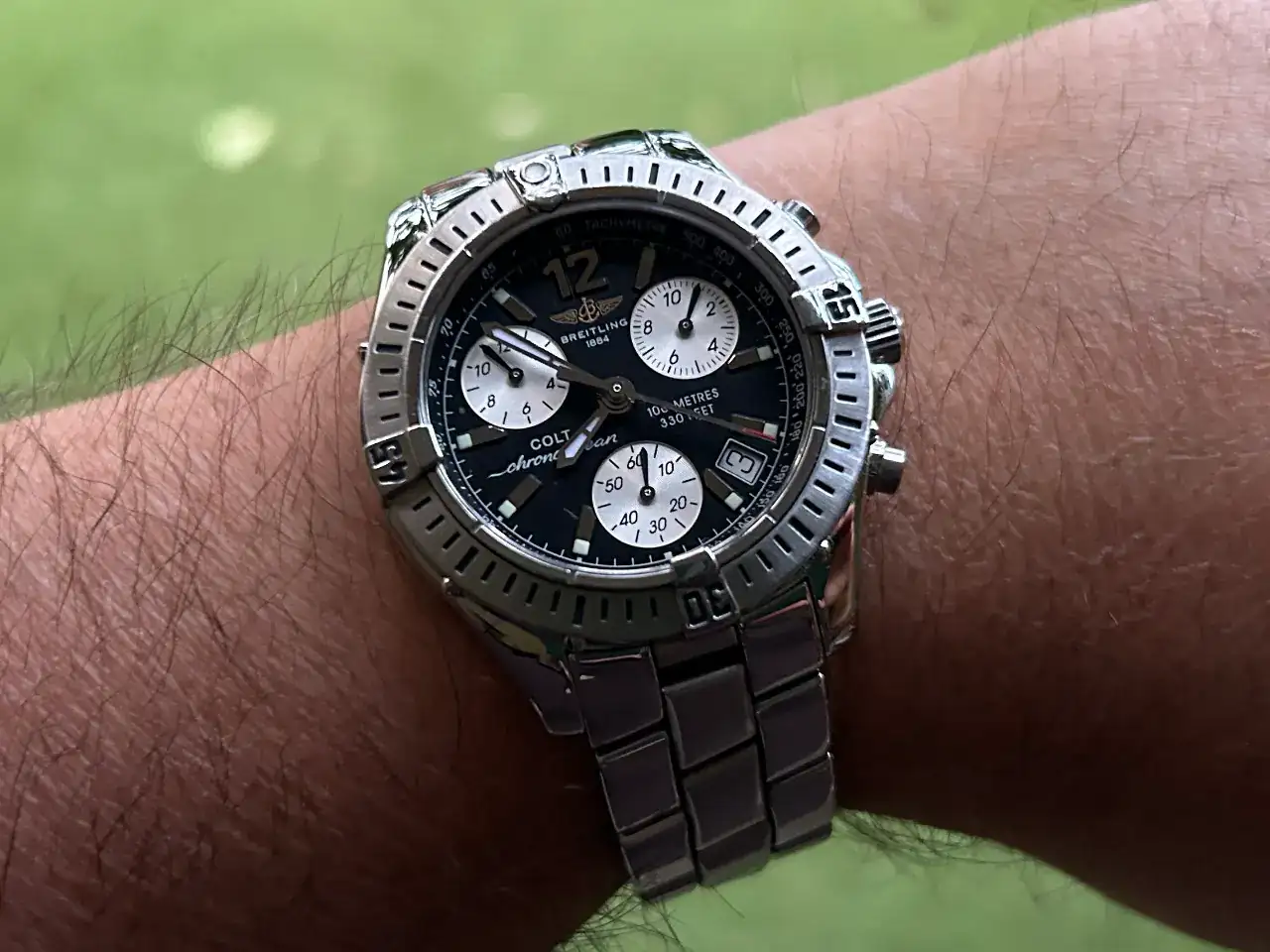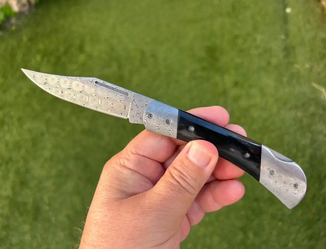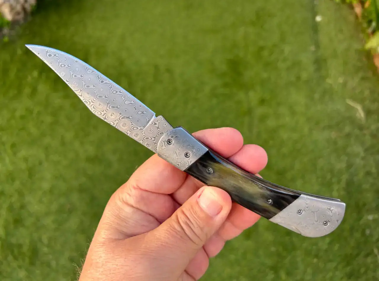 Damasco en gota de lluvia!Buenos días y ya jueves . Hoy con mi Breitling y una foto de una preciosa navaja de acero de Damasco . El mango es de cuerno de búfalo.
