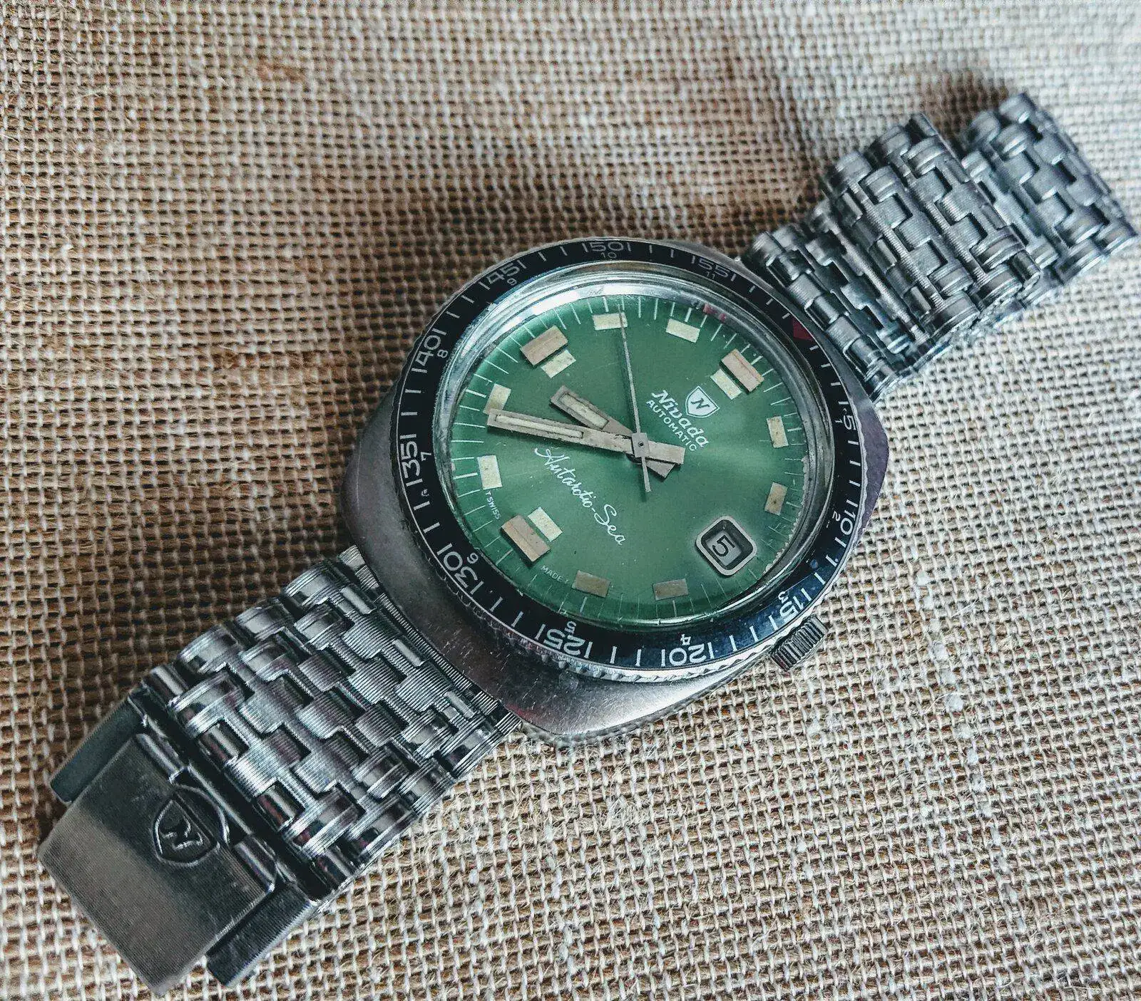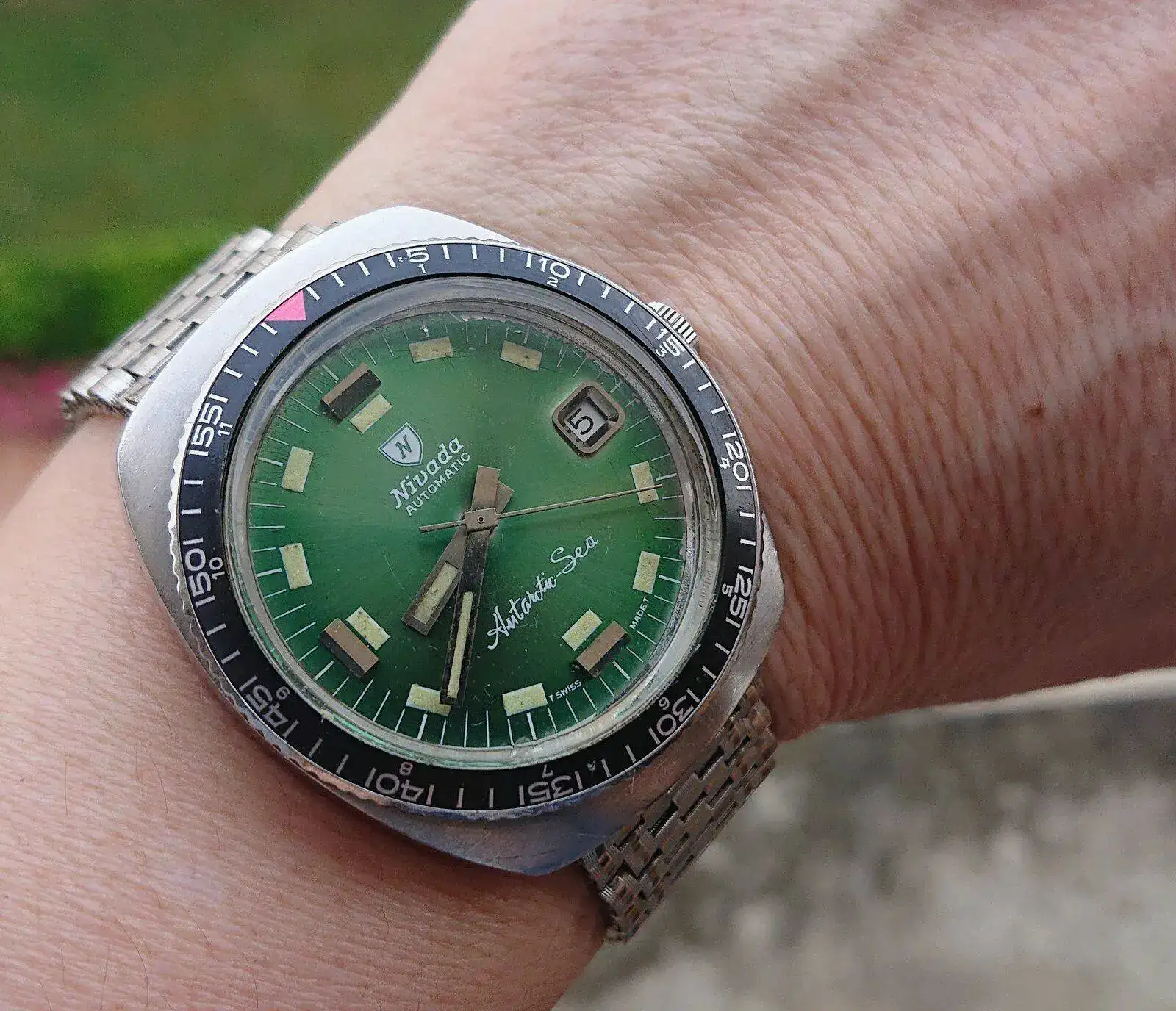 Y el brazalete es una delicia, un NSA de malla, la misma marca que el de eslabones macizos del Zodiac que te gustó hace un par de días.