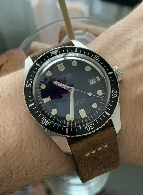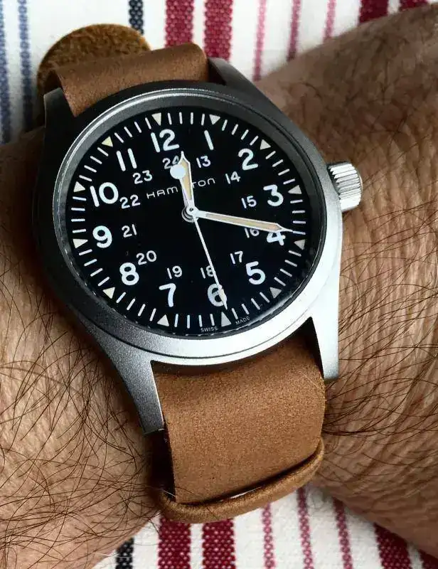 Estupenda combinación, una estética vintage muy guapaFeliz jueves a todos a los confinados y a los que trabajan , haciendo pruebas de relojes y correas me ha salido esta muy setentera: