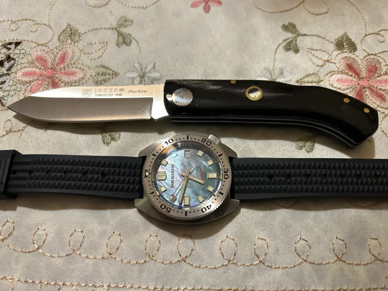 Grandes navajas las Joker 😉Buenos días a todos y feliz jueves . Sigo con mi otra enfermedad, las navajas. Esta vez el reloj y la navaja tienen algo en común y es que tanto la esfera como el mango de la navaja llevan madre perla. Esta Joker albaceteña es una pieza especial , las cachas son de búfalo y en general los acabados son impresionantes.
