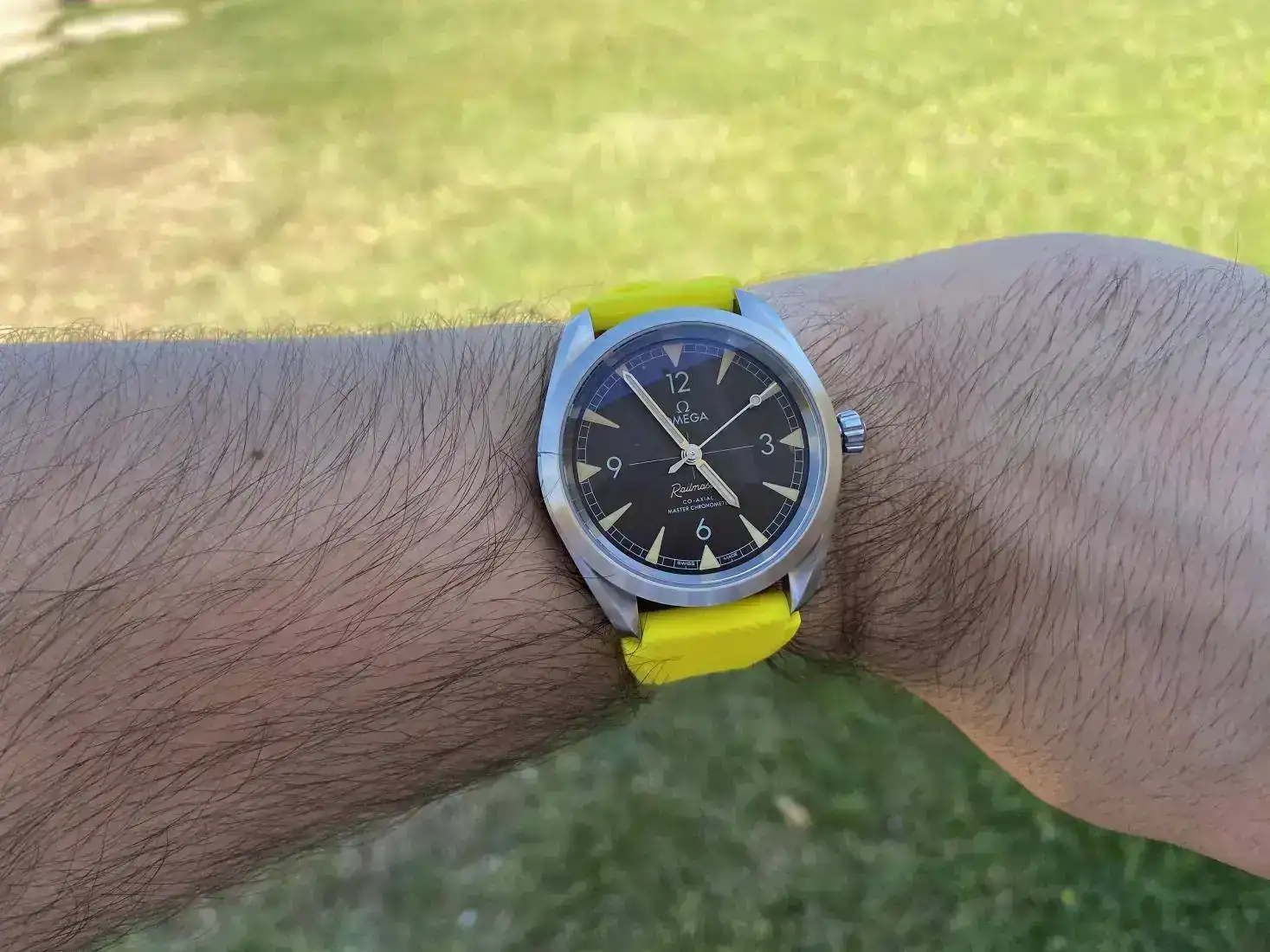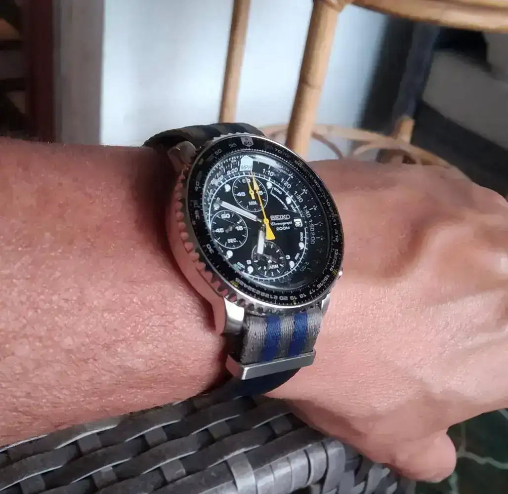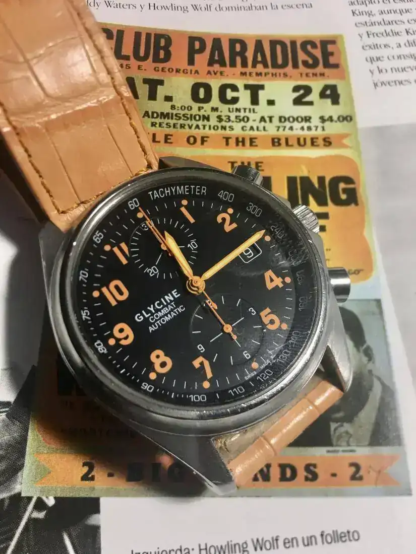 Es precioso ese Glycine, me encanta! Pero con cuero en verano no lo veo; la NATO negra con rallas naranjas que he visto ayer cuando le compre la beige a mi Lawrence le irÃa de órdago, seguro.Feliz jueves. Yo con mi Glycine Combat y a disfrutar.