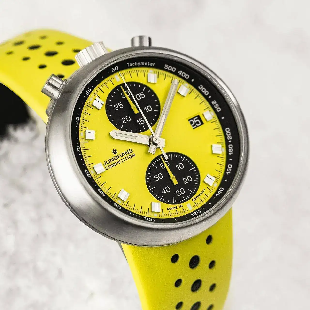 Lively lemon yellow and black livery for this 1970s-inspired bullhead chronograph... Meet the Junghans 1972 Competition FIS Edition Lemon.