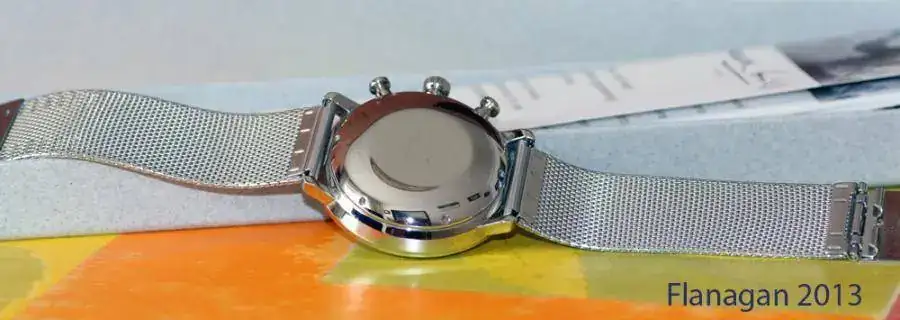 Movimiento mecánico automático J880.2 con calendario, cronoscopio con parada de segundero, agujas luminiscentes y apliques, caja de acero inoxidable Ø 40 mm, Plexiglás duro convexo protegido con una capa de Sicralan, brazalete milanesa con broche de seguridad, resistencia al agua de 30 metros.