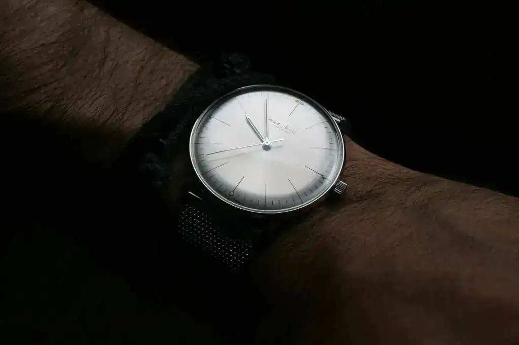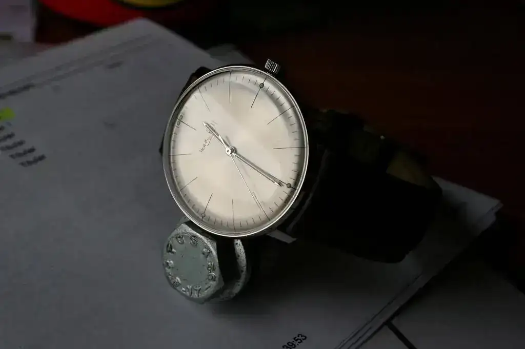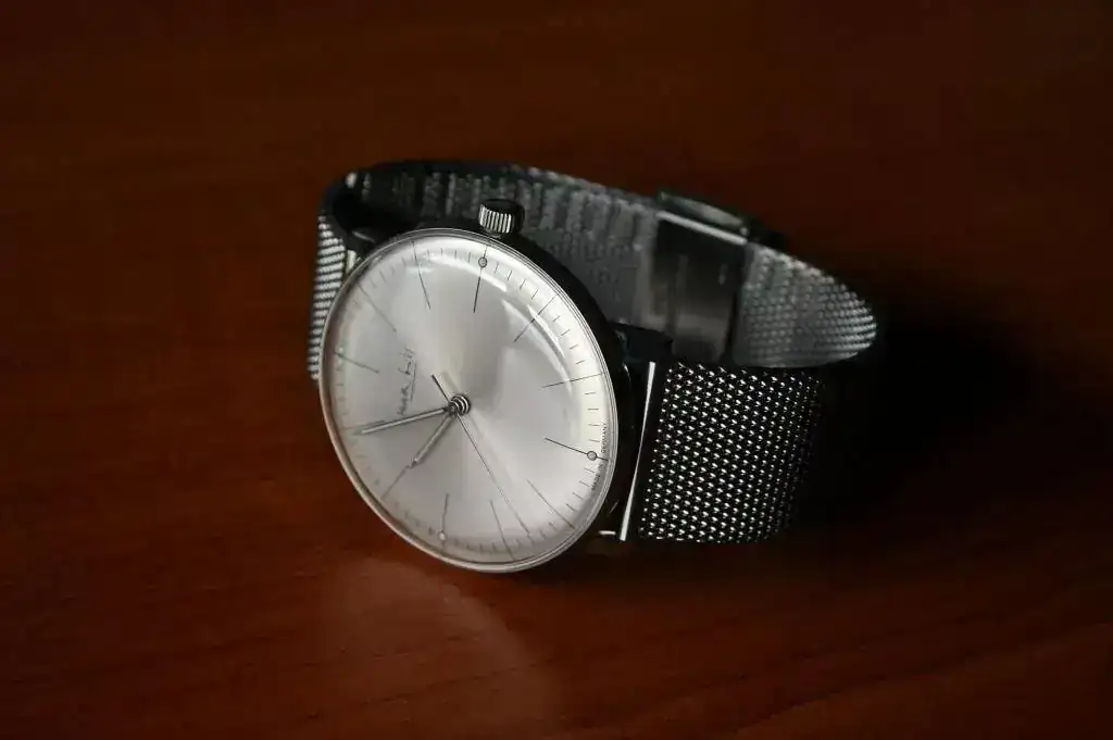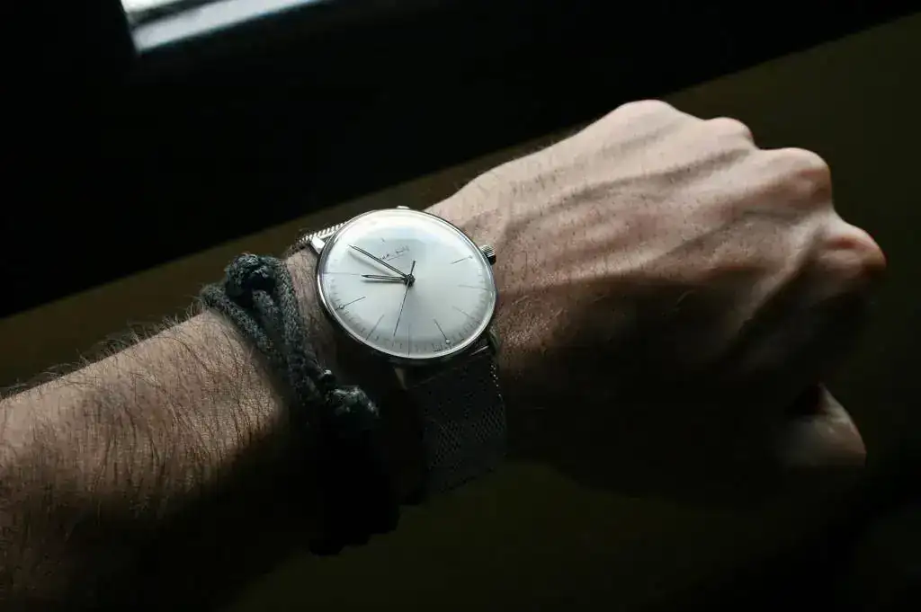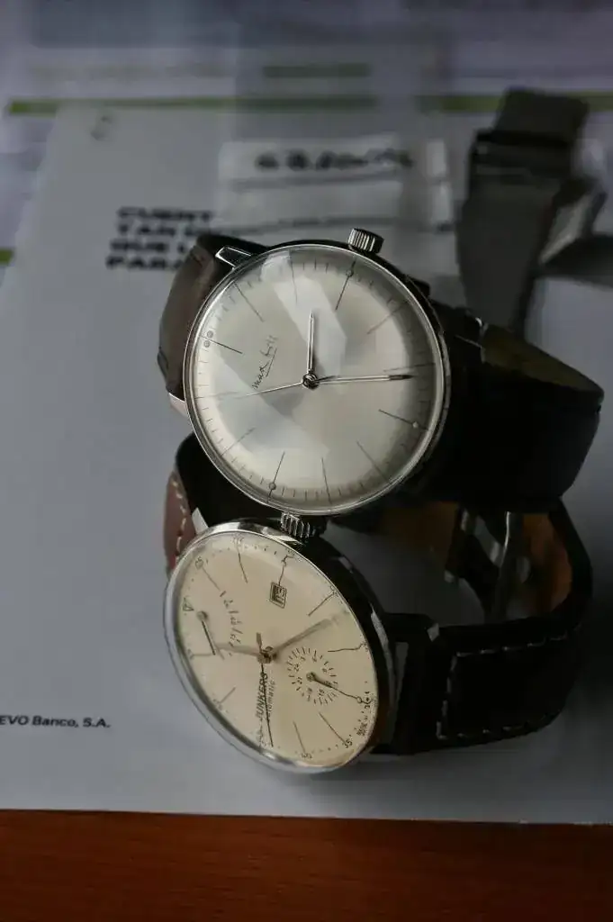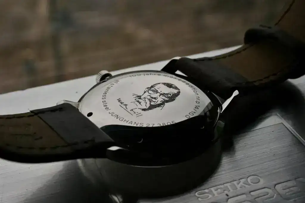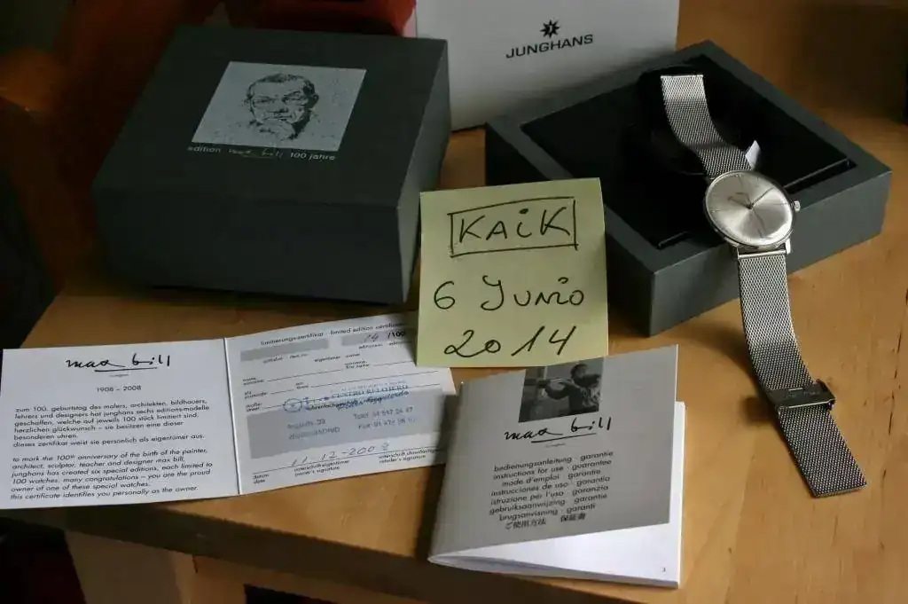 Precioso reloj de vestir de la escuela "bauhaus", sólo hora sin datario, que salío a la venta en 2008 para conmemorar el 100 aniversario del nacimiento de Max Bill, que creó este diseño Bauhaus para Junghans con su característico diseño minimalista de 1962. En el fondo tiene grabada la cara de Max Bill. Edición limitada a sólo 100 piezas y difícil de conseguir