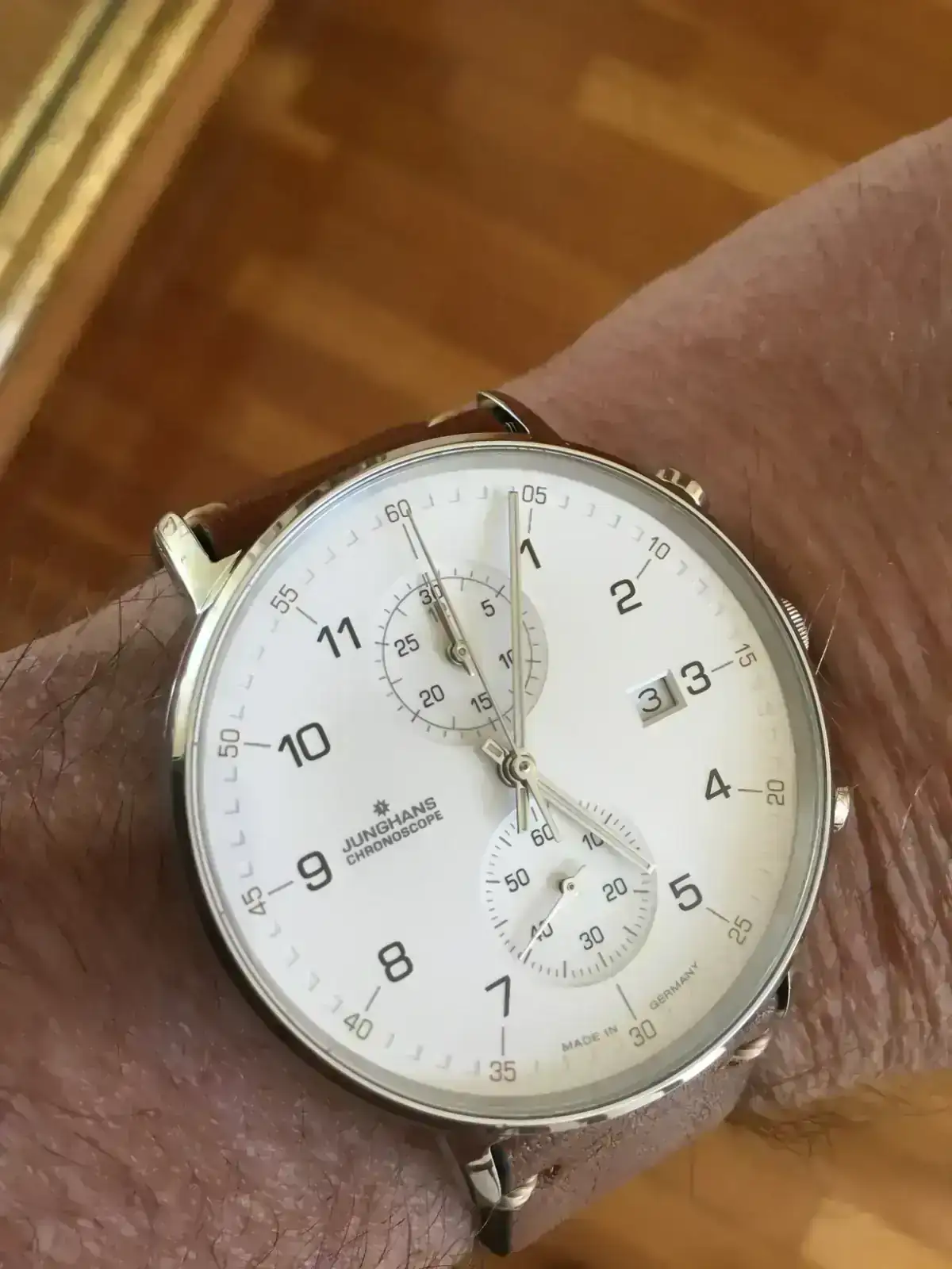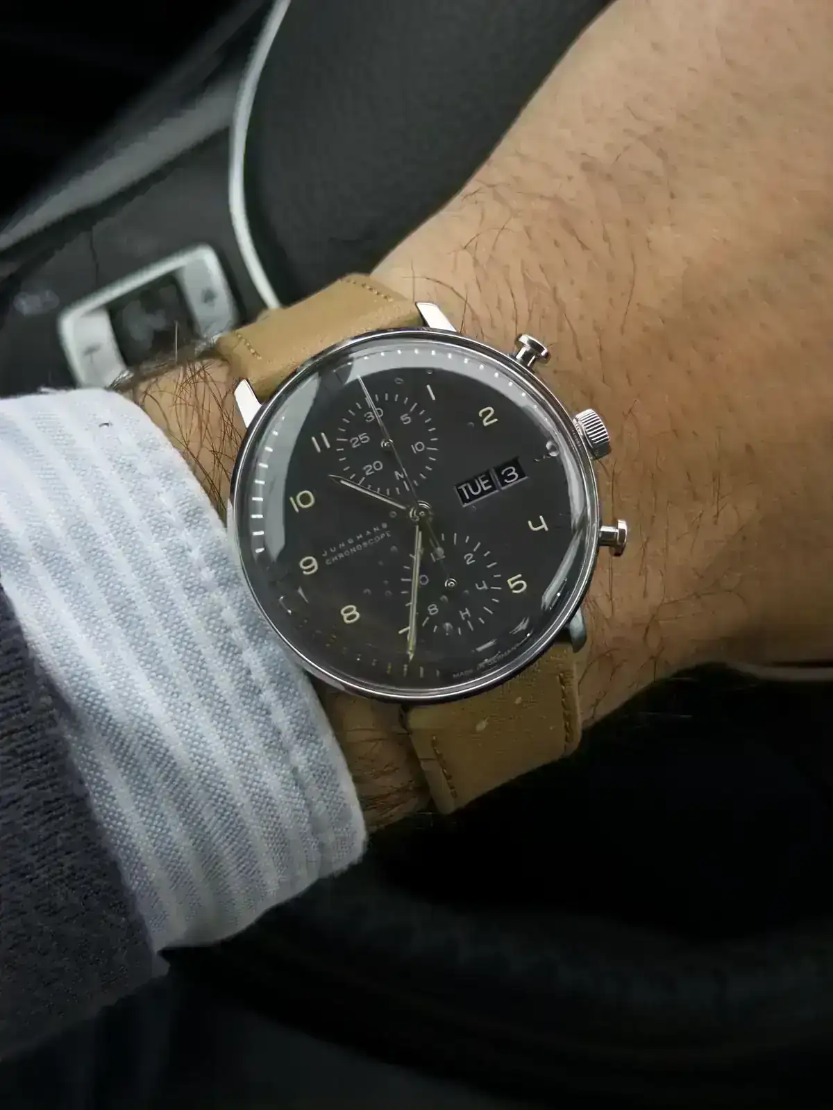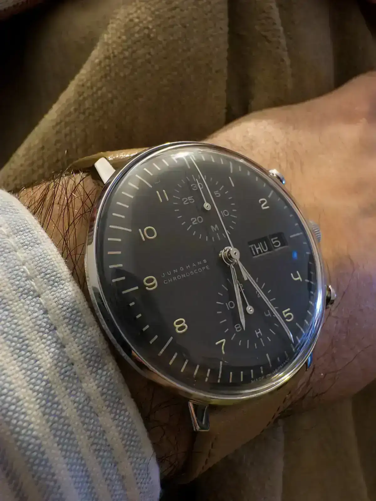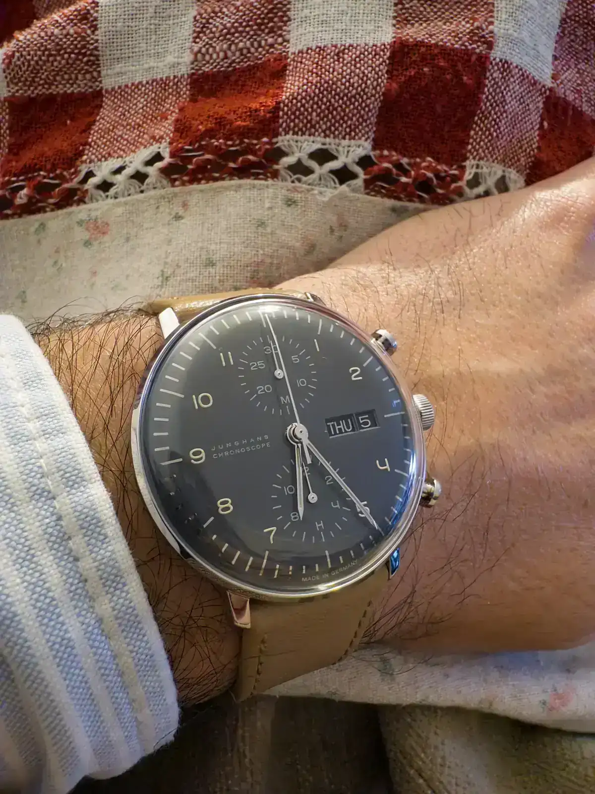 Junghans Max Bill Chronoscope. El negrito, 40 mm de caja (que no, que no es tan grande como parece en fotos) y ese estilo Bauhaus incontestable, limpio, funcional y sin una línea de más. La forma sigue a la función era el postulado de esta escuela de diseño alemán de los años 30 , Apple sigue usando este lenguaje de diseño.