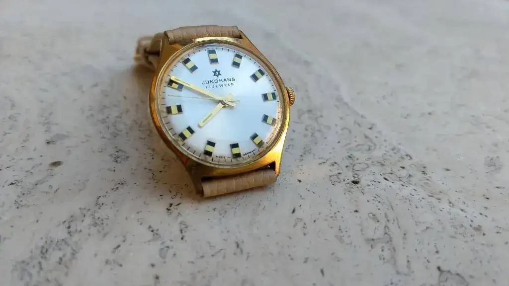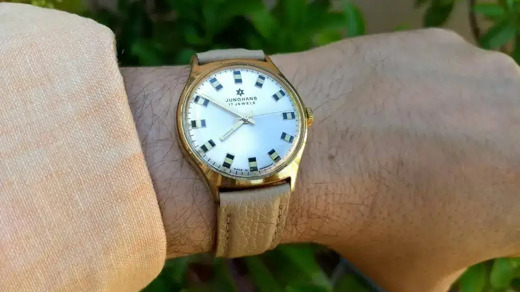 ) de mi caja, hoy saco este guapo JUNGHANS del 72 que me encanta pero uso poco. Es un reloj desenfadado que aúna el diseño minimalista propio de la marca en los 60s con la exhuberancia de la nueva década setentera, aquí presente en los preciosos índices "abeja" que le dan toda la personalidad al reloj.El reloj lleva un calibre manufactura JUNGHANS de carga manual en perfecto estado de funcionamiento. Estéticamente bien conservado salvo las lógicas señales del tiempo en un reloj de 45 años y que le dan el carácter vintage. La esfera nacarada "soleil" está impoluta.