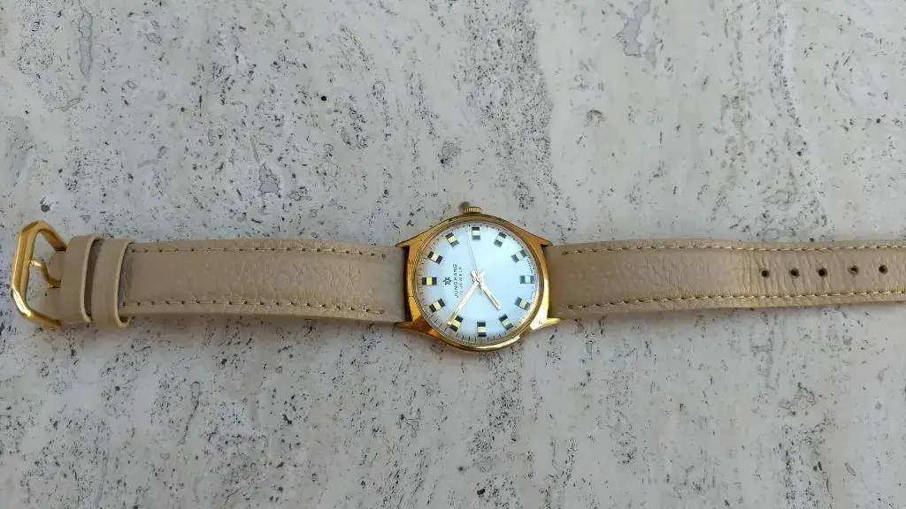 El reloj lleva un calibre manufactura JUNGHANS de carga manual en perfecto estado de funcionamiento. Estéticamente bien conservado salvo las lógicas señales del tiempo en un reloj de 45 años y que le dan el carácter vintage. La esfera nacarada "soleil" está impoluta.