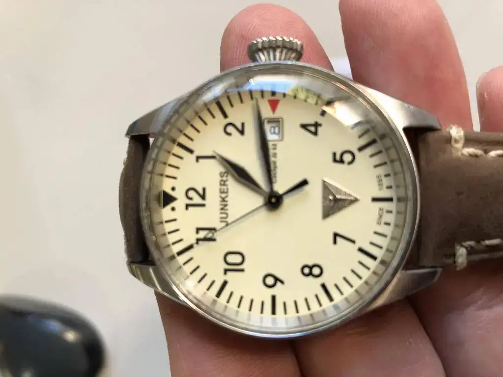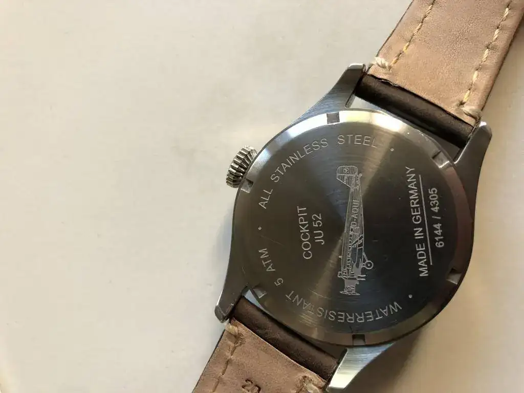 Los relojes de Junkers Cockpit llevan el nombre de la aeronave JU52 que fue desarrollada como un avión de pasajeros que se podía convertir en un bombardero. El aspecto de la cabina JU52 ha sido integrado en este reloj con caja de acero y una esfera color beige decorada con el logotipo de Junkers.