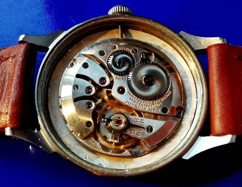 Dentro un precioso movimiento Juvenia MFG cronometro, ajustado en 5 posiciones y temperatura, bajo volante aparece calibre 006, con incabloc y 17 jewels, con tapa antimagnetica ... en Ranfft y en Bestfit, no aparece información alguna del calibre...