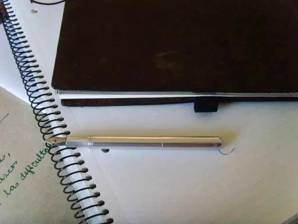 Se trata de la versión aluminio, puesto que para ir en la agenda en el bolso, la negra me parecía que iba a llenarse de rayas en seguida. Un punto EF para escribir en papel regulero sin demasiados problemas. Como veis, escribe muy fino, tal vez por la tinta que lleva, que es la Diamine Prussian blue, o porque no la he lavado antes de entintarla ¡la impaciencia!