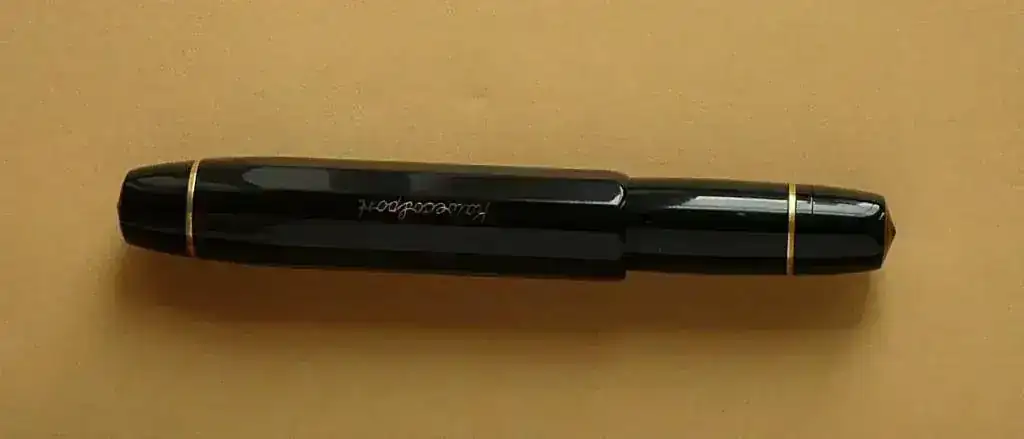 El capuchón tiene un nombre grabado; peeero, si no quereis que se vea, os regalo un clip original, con el que se puede cubrir bastante bien. La pluma, con el clip queda preciosa.