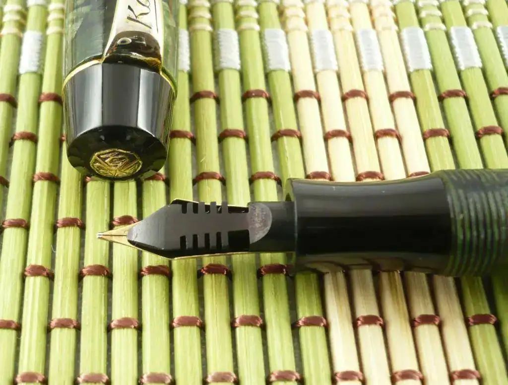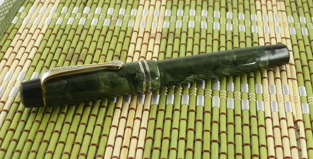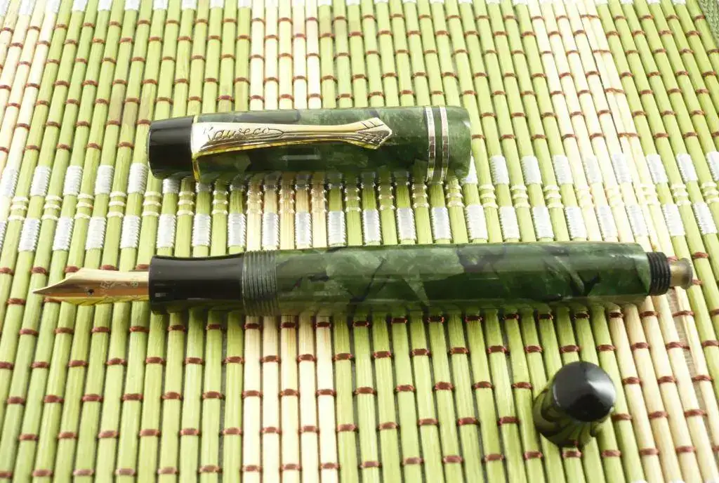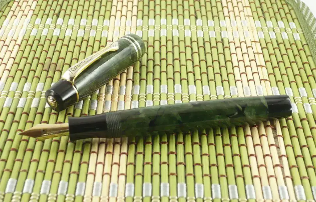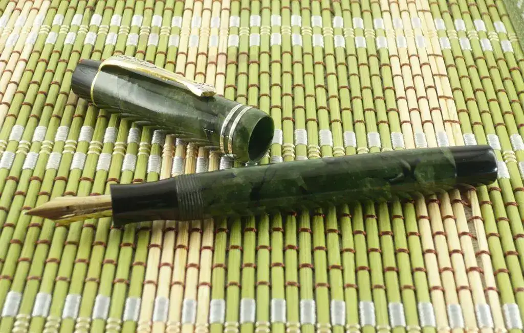El cuerpo y el capuchón son de un celuloide marmoleado de color verde, y los extremos son de ebonita negra.
