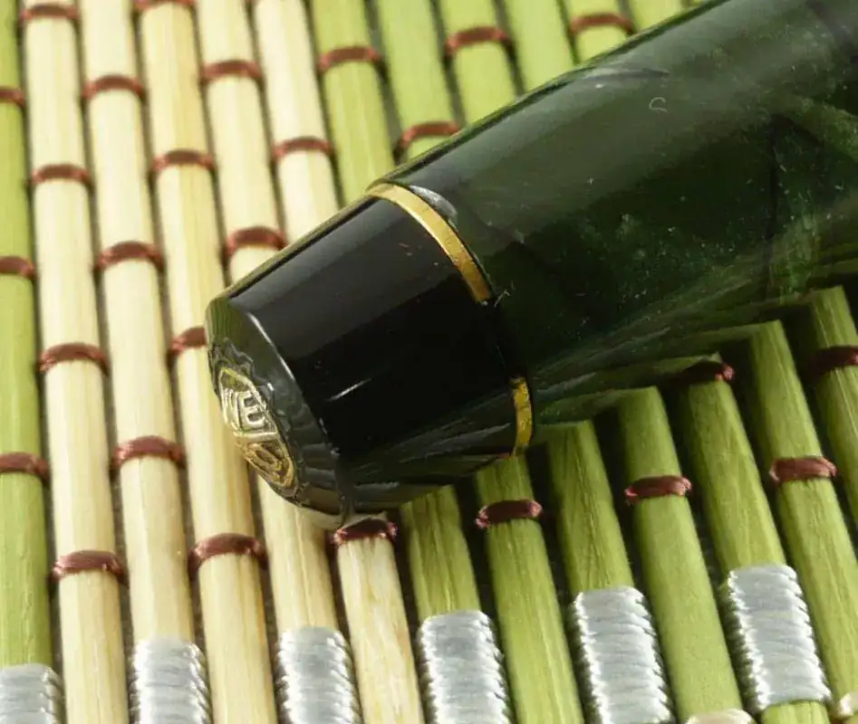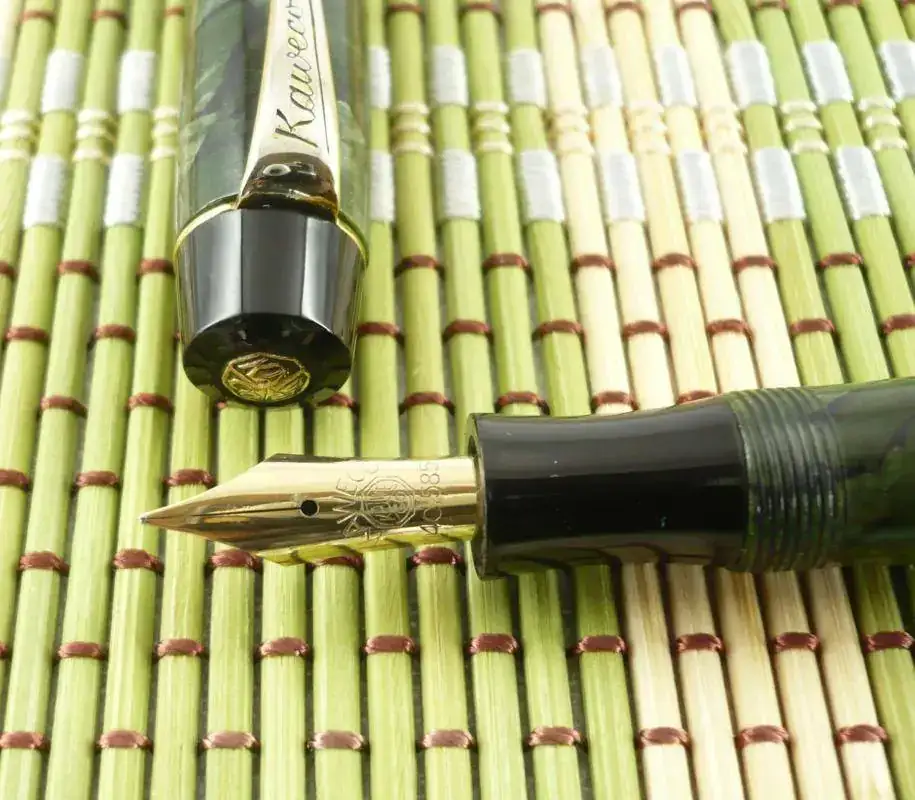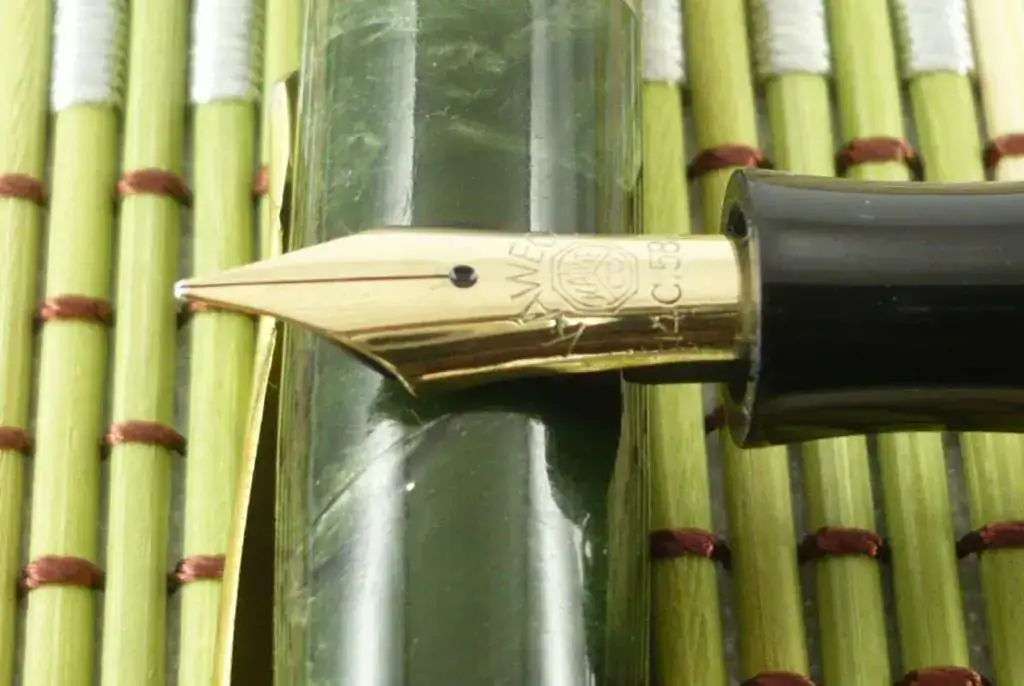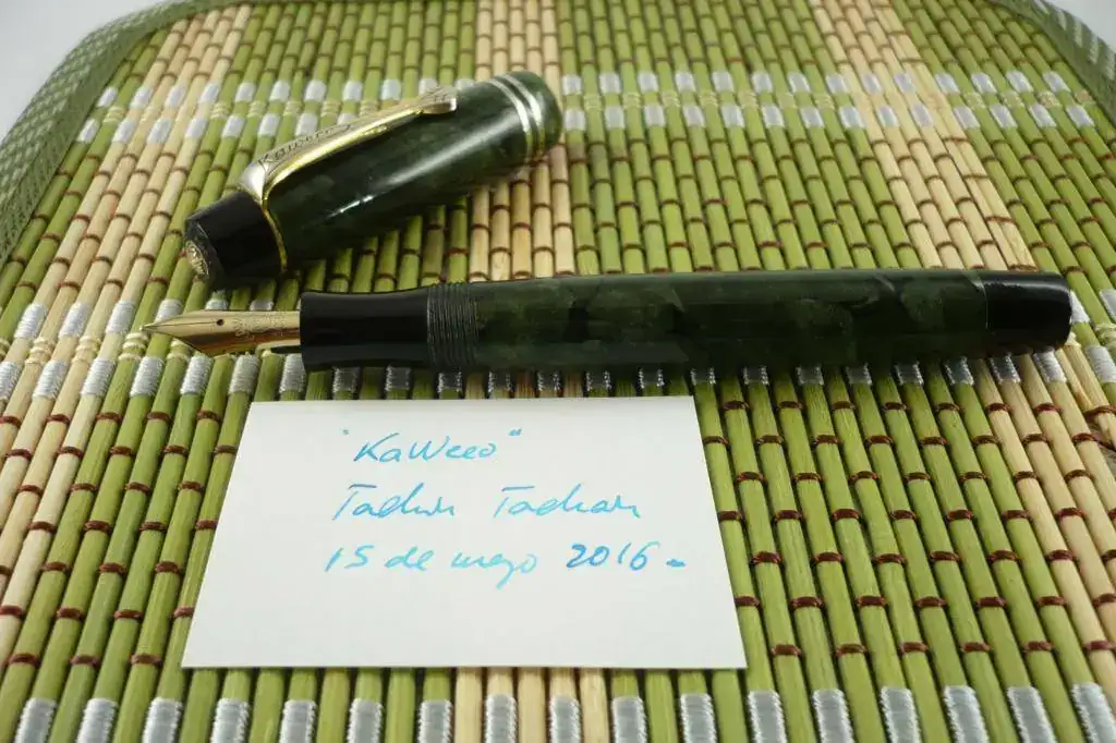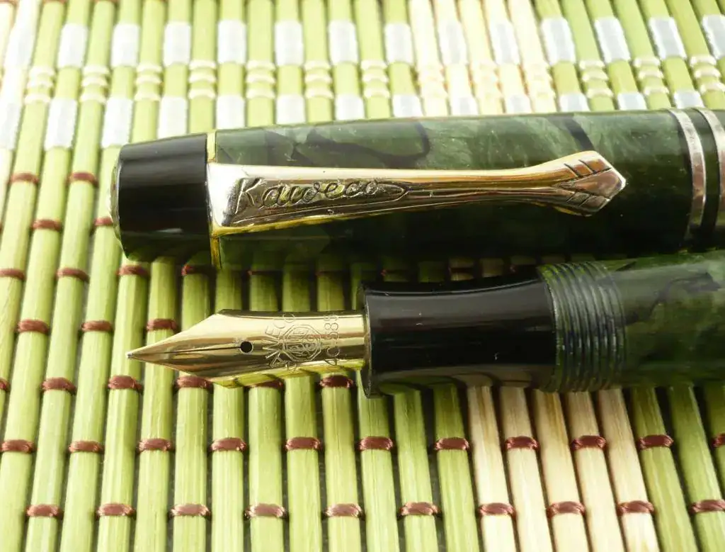 El cuerpo y el capuchón son de un celuloide marmoleado de color verde, y los extremos son de ebonita negra.