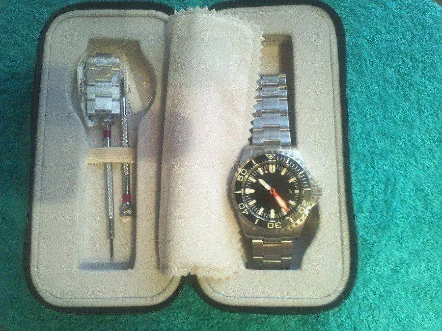 Posibilidad de entrega en mano en Madrid Capital zona centro, Alcampo Vallecas ó Conde de Casal. Lo entrego con su correspondiente factura de compra (me gustan las cosas serias) que incluye número de serie, estuche alargado de polipiel, 2 mini-destornilladores para eslabones y por supuesto todos los eslabones sobrantes para el nuevo dueño.