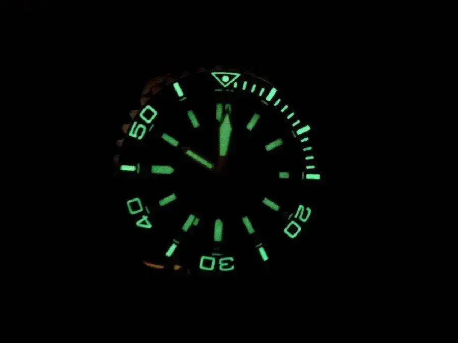 Impresionante lumen nocturno. Tratamiento superluminova C3 (verde claro) en el bisel. Superluminova C1 blanco en esfera y agujas tipo plongeur.