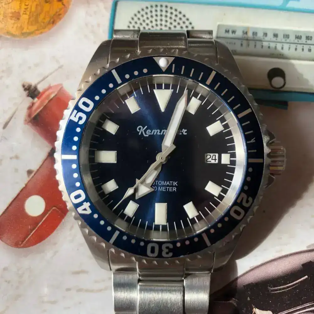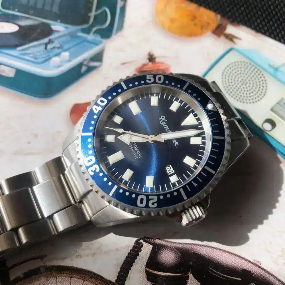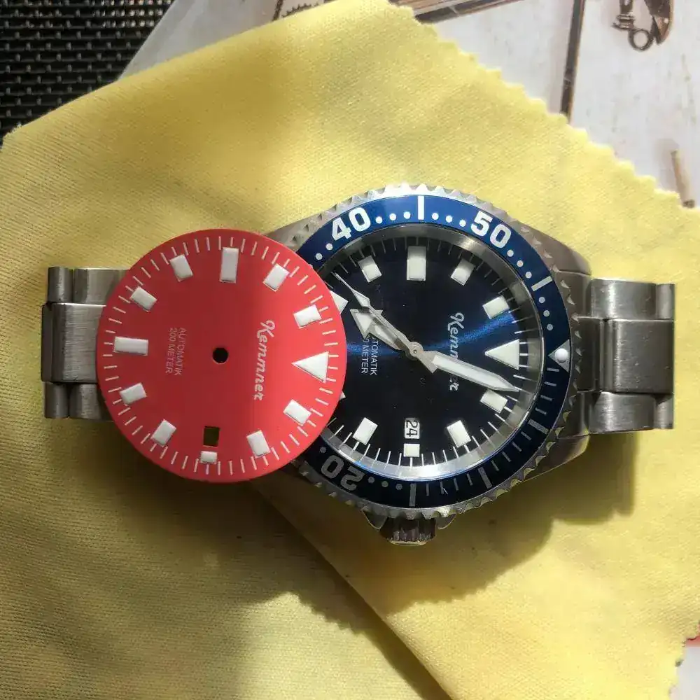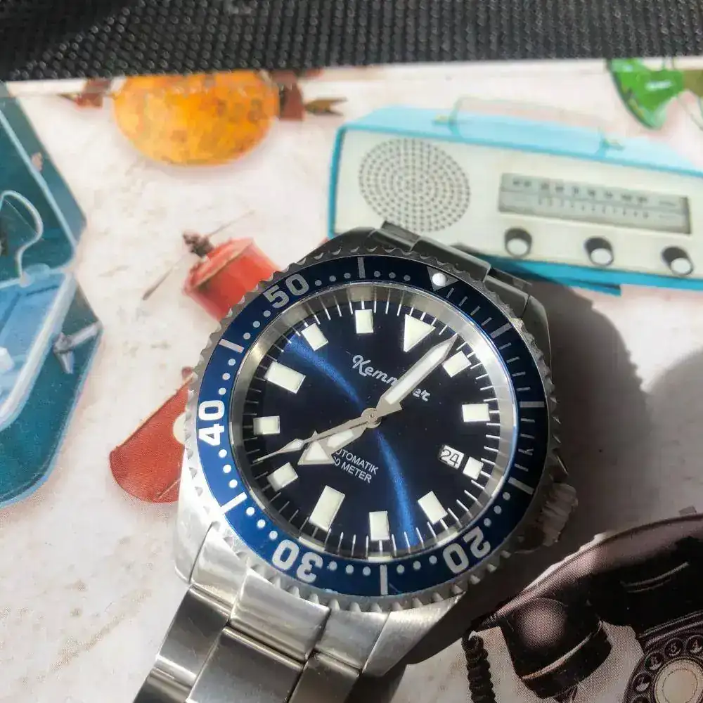 Pues sí ,aunque parezca extraño NO es un Kemmner Octopus en un Turtle, un reloj alemán muy raro de ver en estos lares. Es un diver cómodo de llevar de 42mm. sin corona. Lo he usado solo en verano en rotación con otros divers veraniegos, algún bronce, etc. Tiene algunas micro rayas del uso pero no alcanzó a ver nada significativo. La esfera azul y el bisel son nuevos (les cambié porque los quería azules). Envío también una esfera de color entre rojo y rosa (seguro que habrá alguien que ponga nombre a ese color) por si apetece cambiar. Tiene una superluminova C1 que se ve genial en la oscuridad.