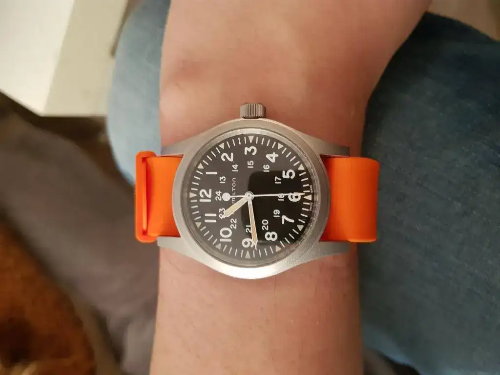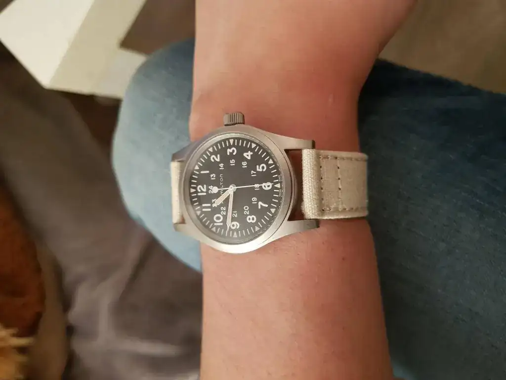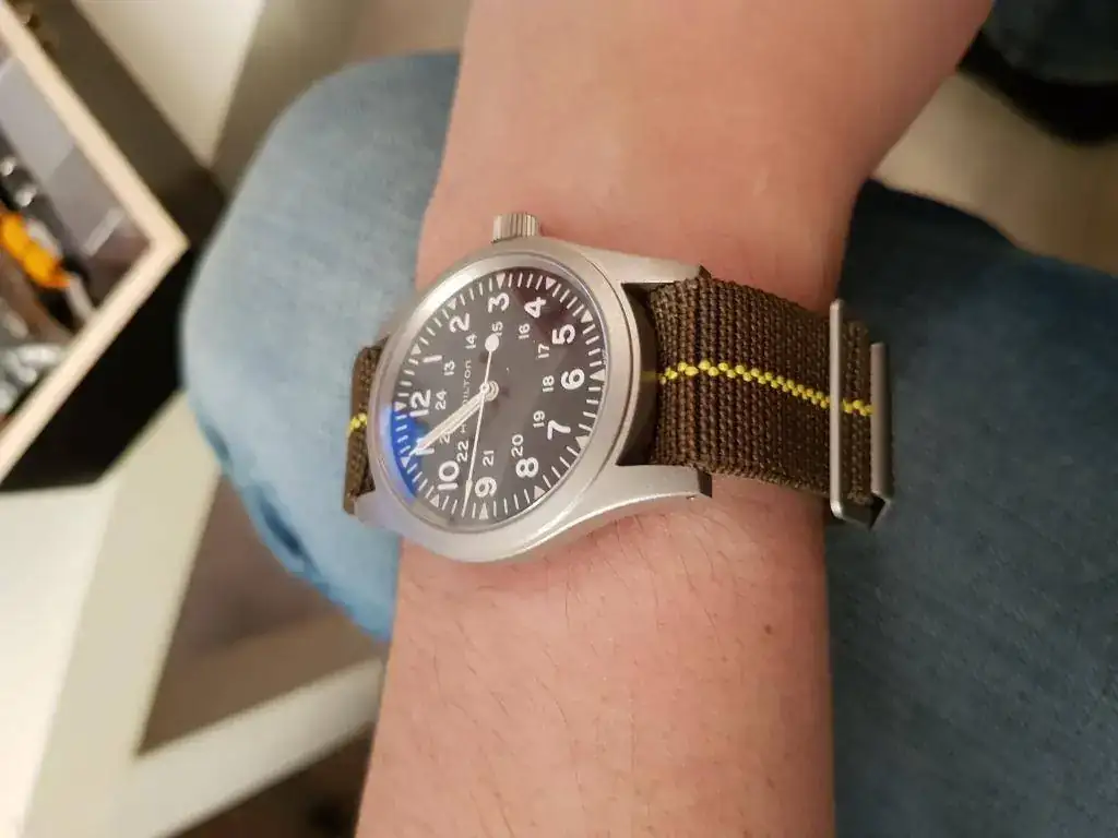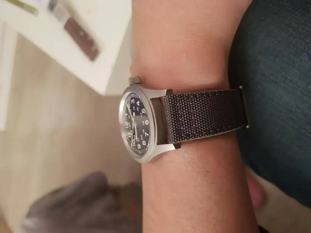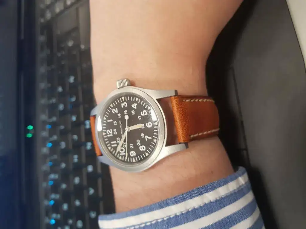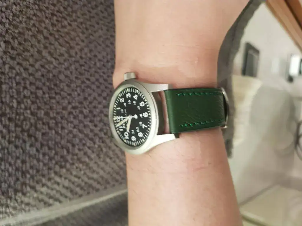 Como dicen en esta review de relojes asequibles, el khaki es un auténtico strap monster, pero debo decir que las asas son muy largas y no me acaba de gustar el hueco que queda entre la correa y el reloj. Además, la NATO de piel es una pasada: creo que cualquier persona que tenga un Hamilton con 20 mm entre asas debería comprarse la NATO de piel original.