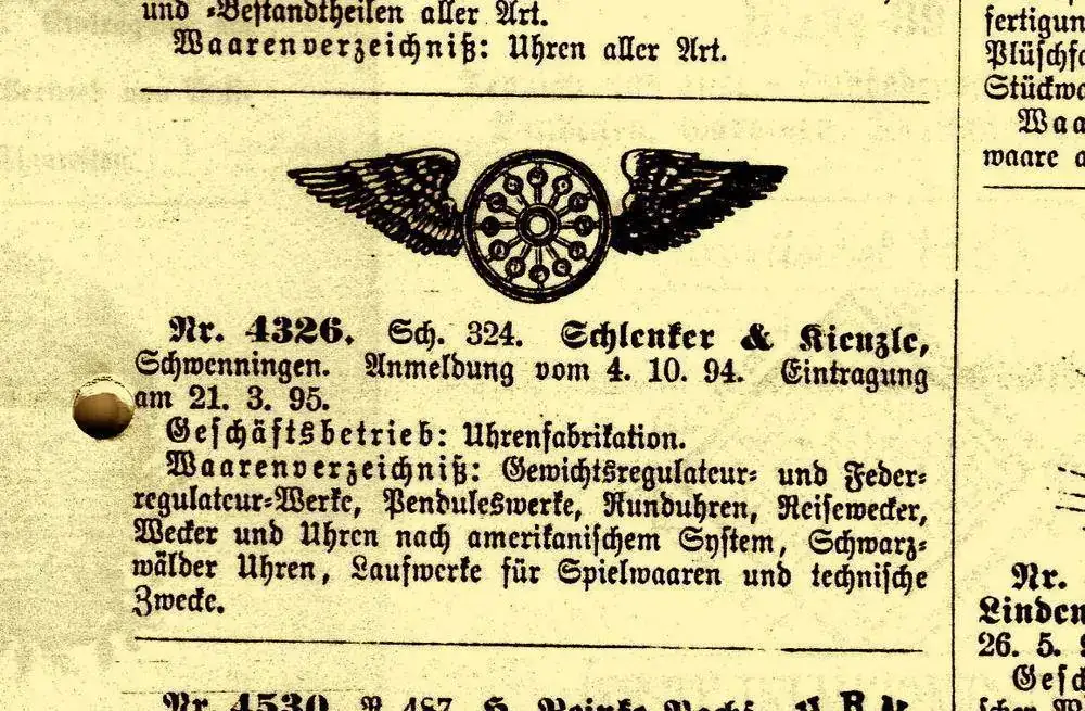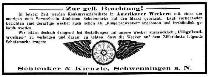 La fusión tuvo lugar en 1883. La firma firmierte bajo el nombre de "Schlenker & Kienzle" y la serie fabricada de reloj despertador y regulador de 14 días funciona con engranajes de acero. Como logotipo de la empresa, optaron por el llamado "impulsor".