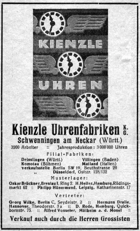 Los altos aranceles de importación en Austria / Hungría hicieron necesaria la apertura de una sucursal en Komotau en Bohemia. Se establecieron otras sucursales en los años siguientes en Milán, París y Londres. En 1898, Carl Johannes Schlenker se retiró de la empresa conjunta. Por cierto, fue nombrado por la casa real de Württemberg por sus servicios al Consejero privado. Con la salida de Schlenker, Jakob Kienzle se convirtió en el único propietario de la fábrica y la renombró, pero solo en 1919 en "Kienzle Uhrenfabrikation".