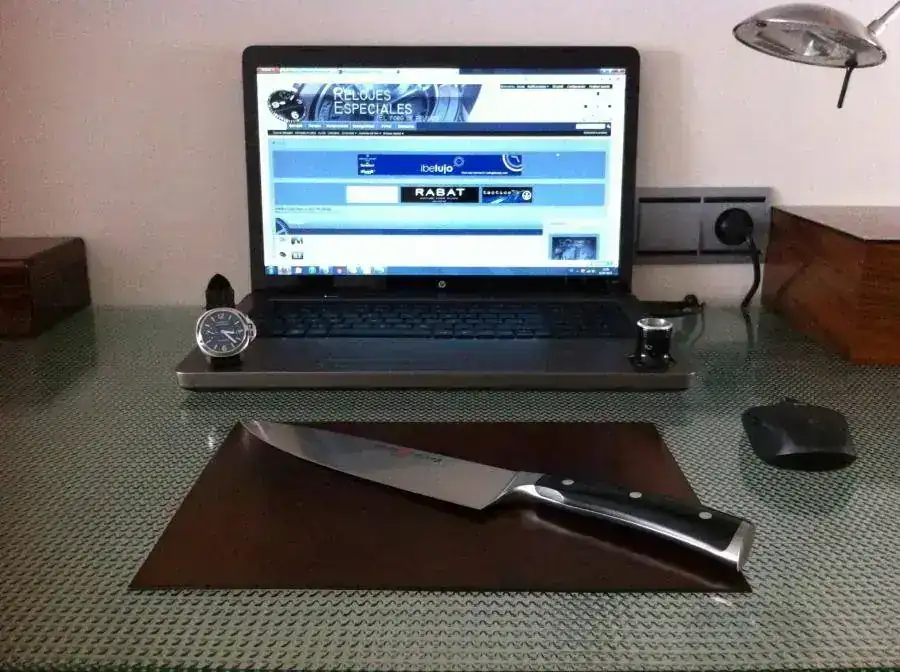 Obsérvese el escritorio de madera maciza con la cartera de piel a modo de útil de escriba, los relojes automáticos (un 7750, un reloj con calibre japonés, un 2824 estándar), una navaja suiza, una pluma Waterman de batalla (dada la excelente calidad del trazo de estas estilográficas) y una pluma de representación Mont Blanc Mozart (su pequeño tamaño la hace ideal para llevar en la camisa asomando el logo de la conocida marca de lujo).
