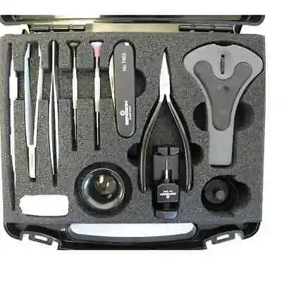 6767 Steel spring bar tool (6767-S), Swiss made mini jaxa wrench with square pins (2819), Swiss watchmakers pocket/case knife (7403), Swiss 5x eye loupe (2611-2.5), Non-Magnetic tweezer #00 - Swiss stainless (7026-00), 2 Swiss made stainless screwdrivers (1.00mm + 1.60mm) (30081-100, 30081-160), Swiss plastic battery tweezer (6460-P), Swiss bracelet pin tool with 0.80mm pin (7230), Flat nose plier (2510-N), Microfiber cleaning cloth (7039), Flexible bracelet gauge (6789), Spare tips for spring bar tool, screwdrivers and bracelet pin tool (6767-A, 6767-B)
