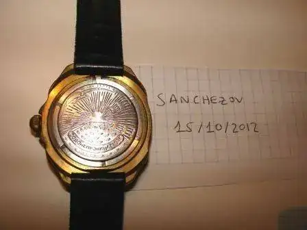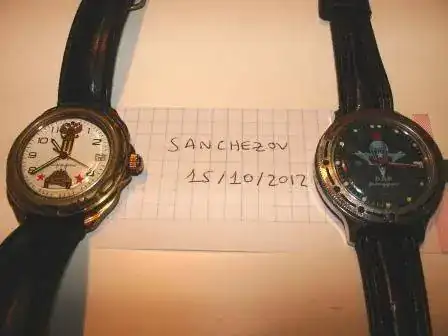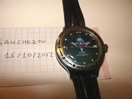 Es otro Komandirskie (Paracaidistas): Automático de 40mm de ancho sin corona, y funciona correctamente (aunque no sé qué bien va de ajuste). Presenta marcas de uso y el bisel ha perdido color, por ser plástico. Comprado por mí en Moscú en el año 2000 y usado por mí unos 2 años....y esos 2 años fue genial, y muy ajustado, pero ahora seguro necesita un repasito. He de decir que cuando lo llevé puesto, no pasaba nunca desapercibido.