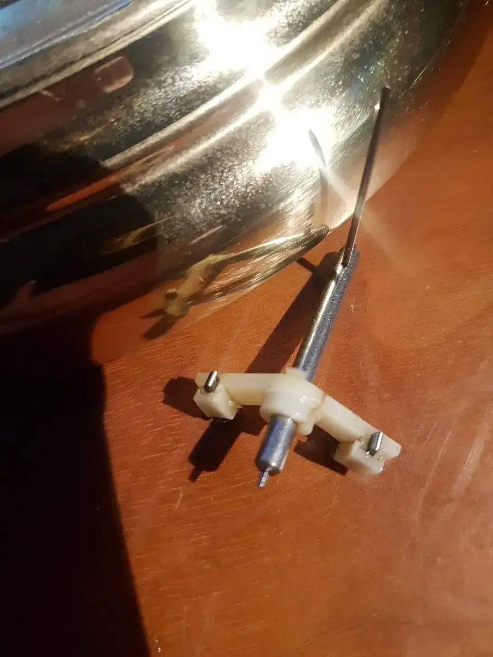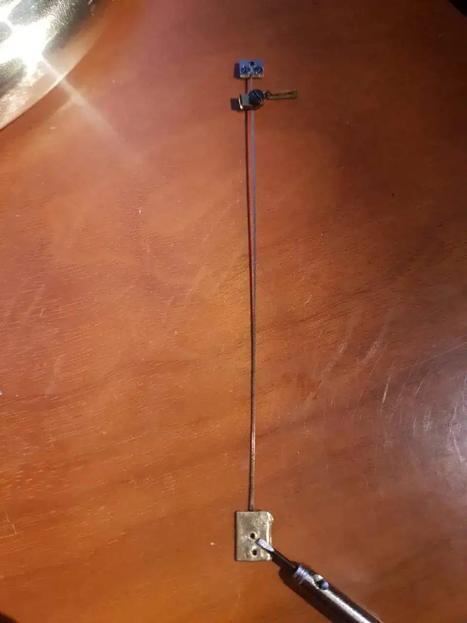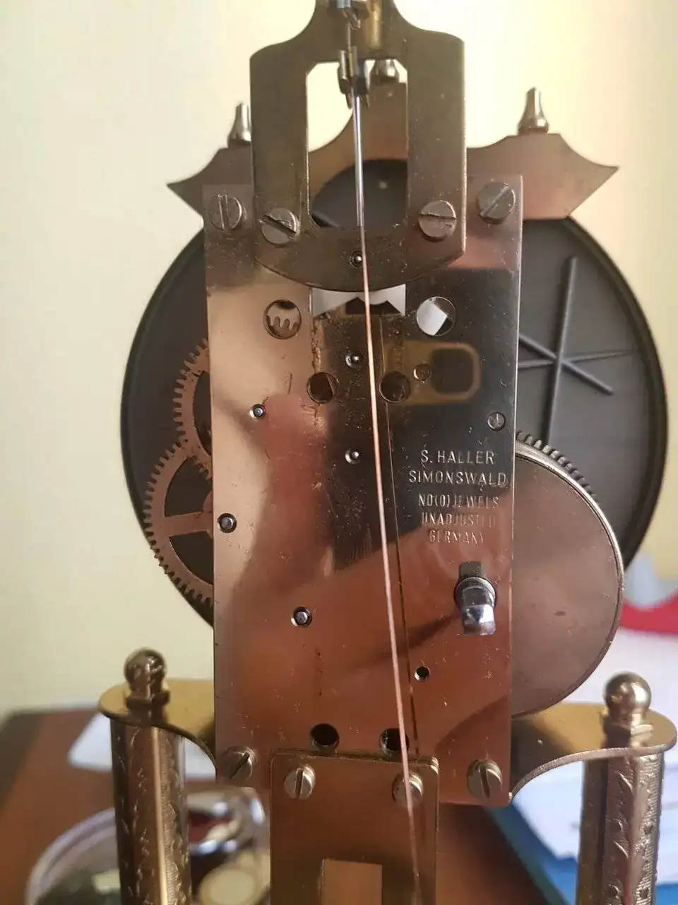 Tiene rota la suspensión por la parte de abajo y le falta la pieza de enganche con el péndulo y para probarlo le he apañado un trozo de suspensión y lógicamente se para.