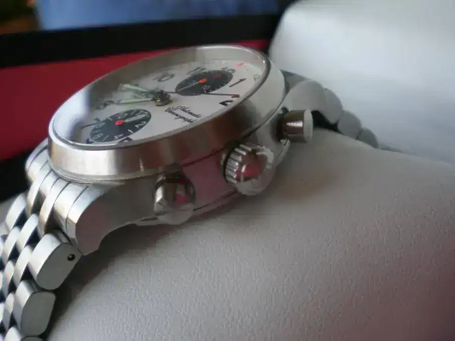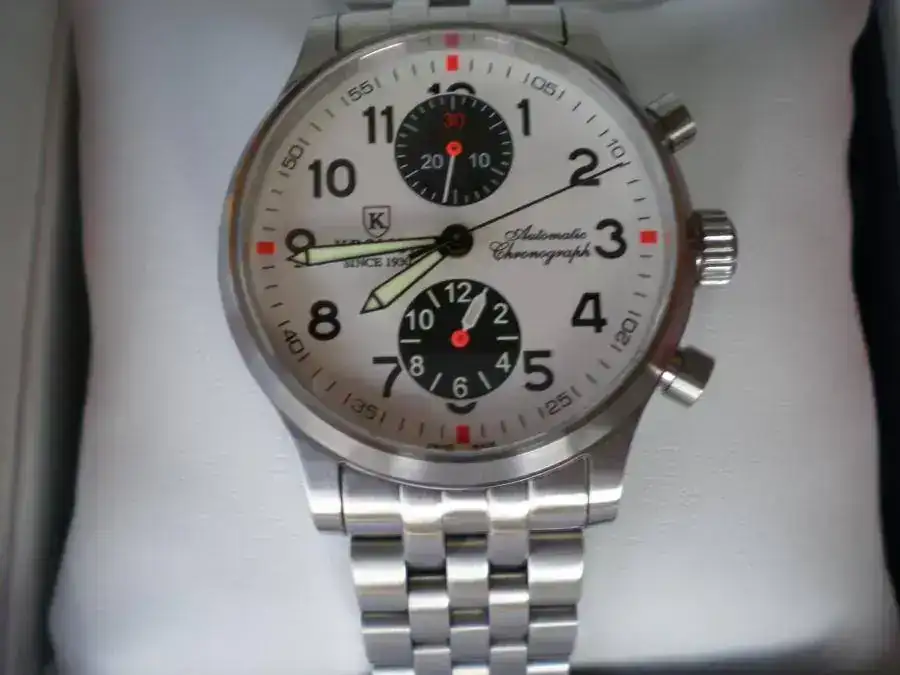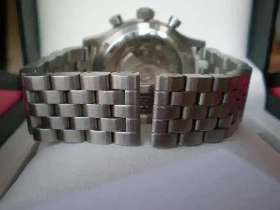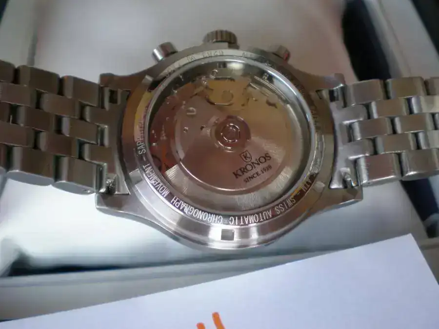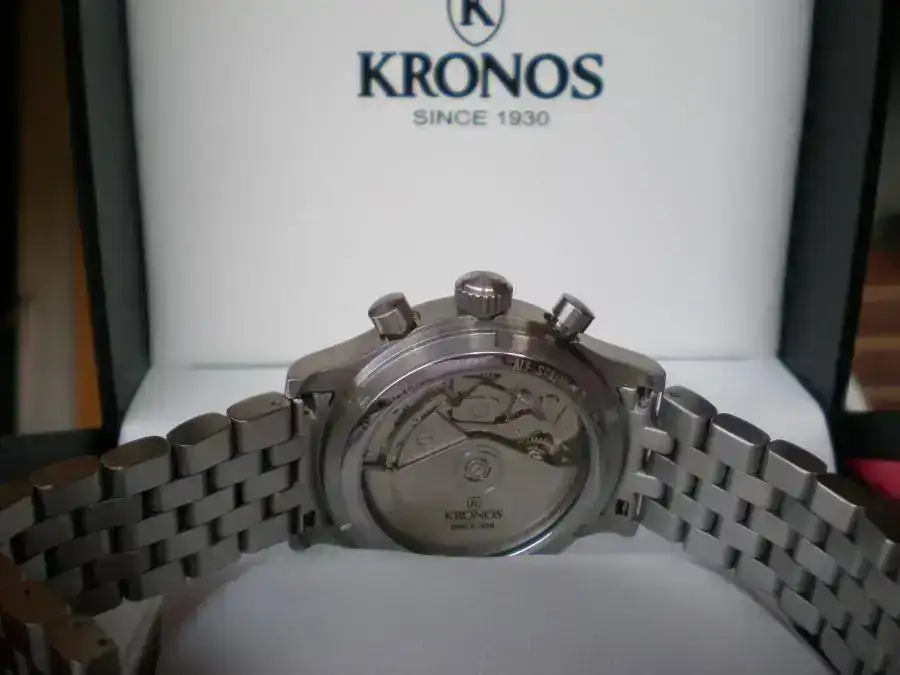 Vendo este bonito reloj de muy buena calidad, marca Kronos (española) swiss made. Me ha sorprendido gratamente la sensación que trasmite la caja y brazalete así como el anti reflejos del cristal de zafiro. Viene con su caja y garantía sellada en Junio de este año por distribuidor oficial de la marca.El estado es prácticamente sin uso, no le veo marca alguna y trae todos sus eslabones.