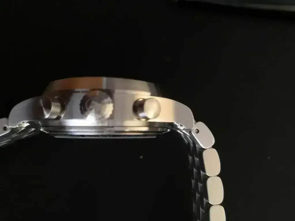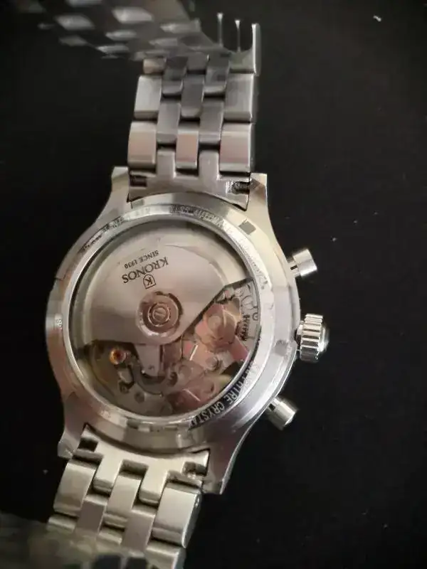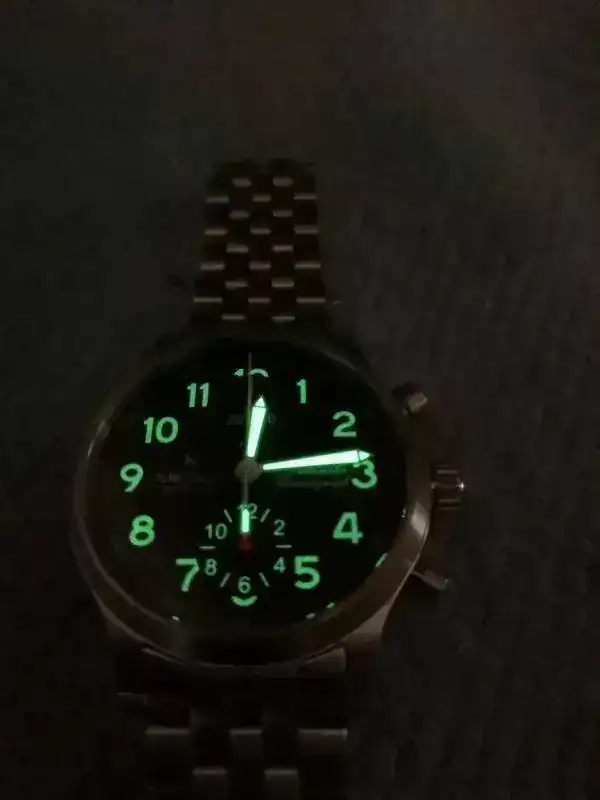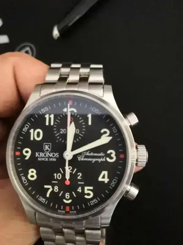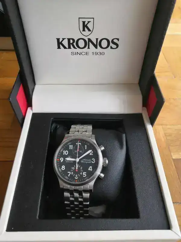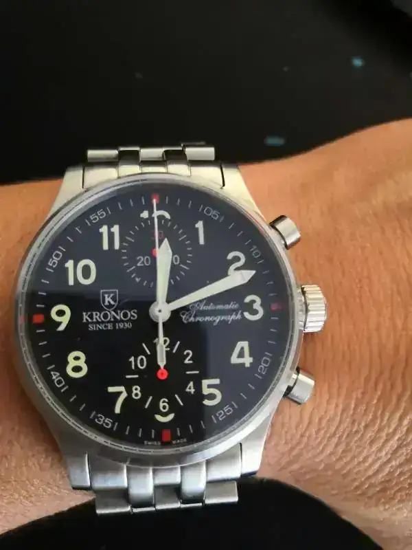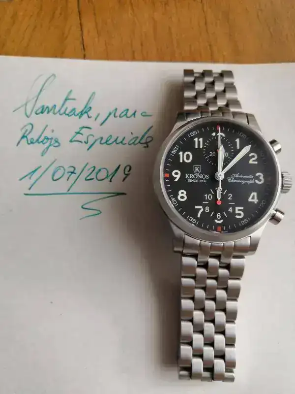 Buenas dias compañeros.Pongo en venta mi Kronos Pilot Cronograph. Yo diría que el reloj está en estado de reestreno, sin marcas en caja, esfera o zafiro, y sólo algunos pelos en el armis. Monta una maquinaria ETA Valjoux 7750, con fondo visto de cristal mineral, esfera con cristal de zafiro, un lumen que no está nada mal y , sumergible hasta 50 m, 40 mm de diámetro y 13,5 mm de alto, que lo hace muy cómodo con camisas. El armis está ajustado a muñeca de 17,5 cm. Se incluye entrega con caja original eslabones sobrantes, garantía de Unión Suiza Relojeros y manuales. Y poco más que añadir.