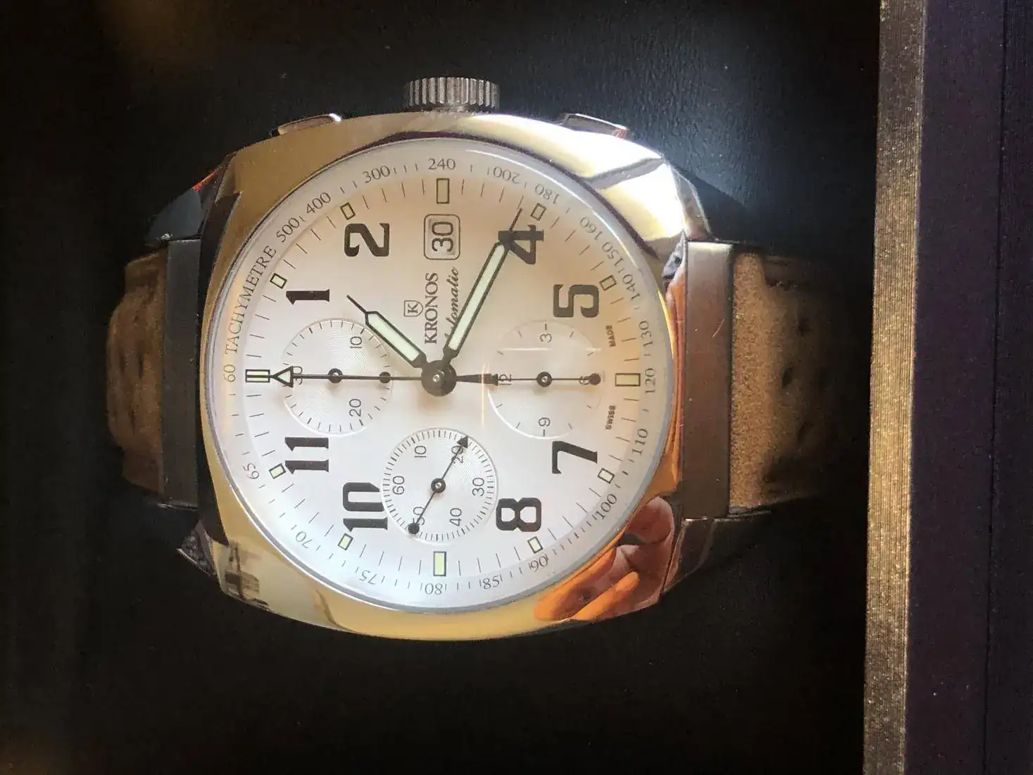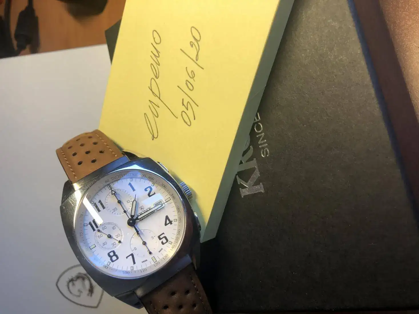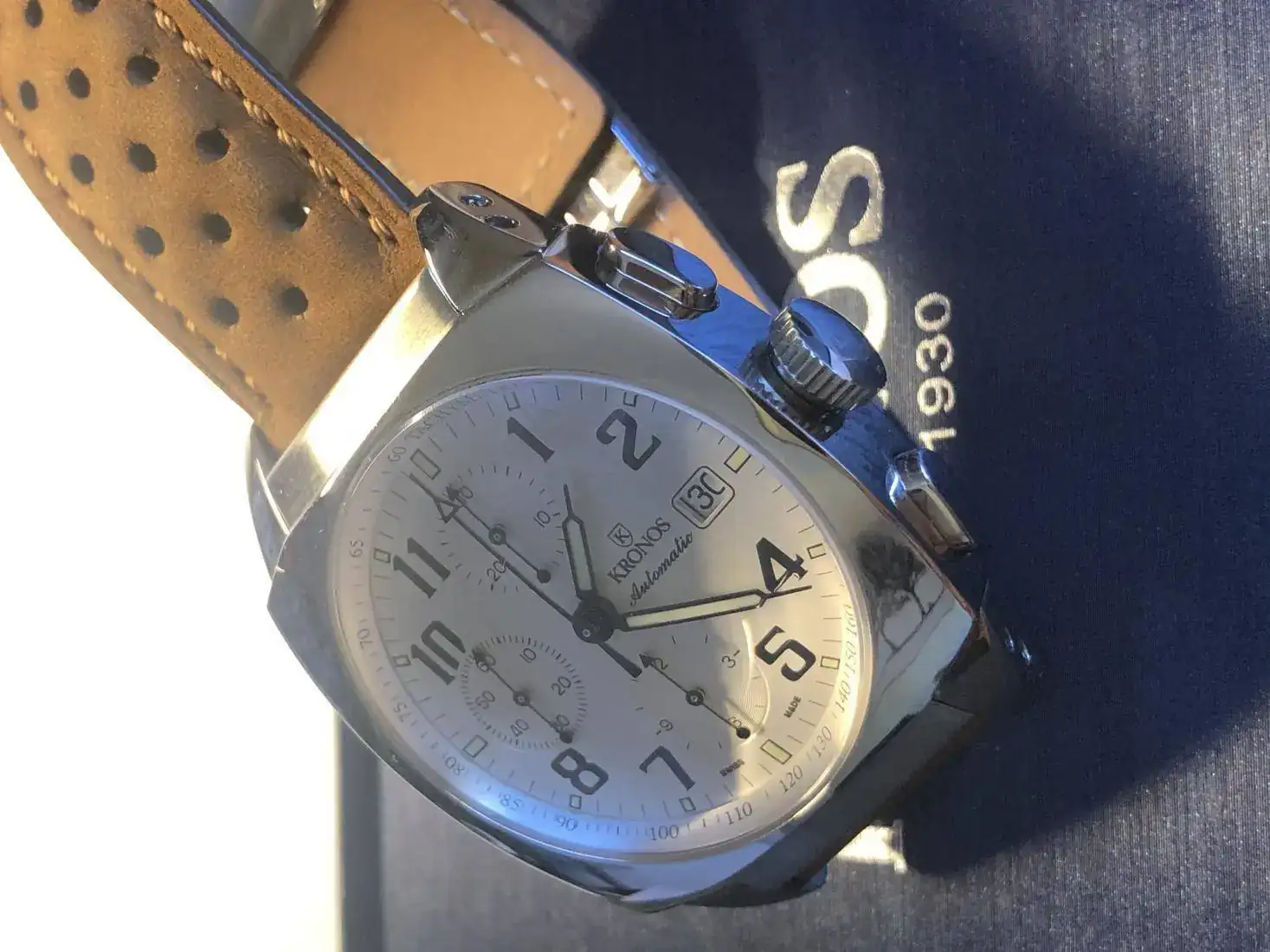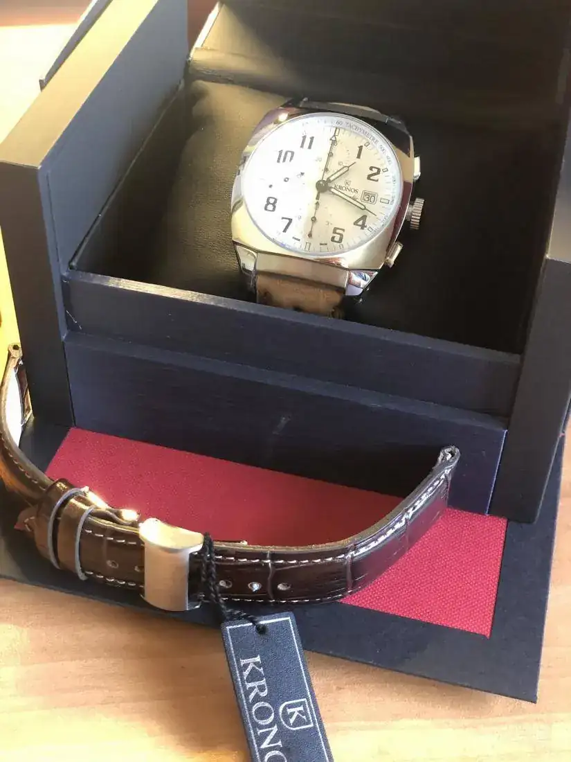 Hola, vendo este precioso reloj Kronos en un estado de auténtico re-estreno, con plásticos y con correa extra tipo rally nueva preciosa que le queda genial, la suya de coco con deplo está sin estrenar, este reloj tiene un pvp de 1.250€ y yo lo saco con un 52% de descuento.