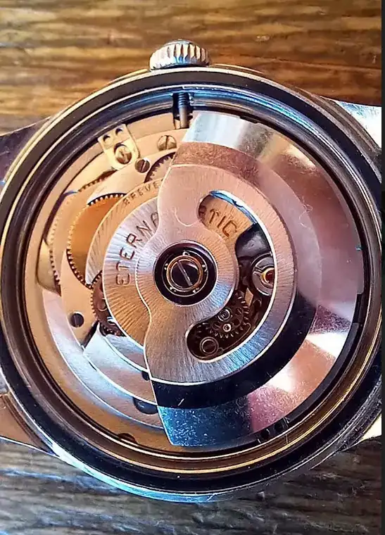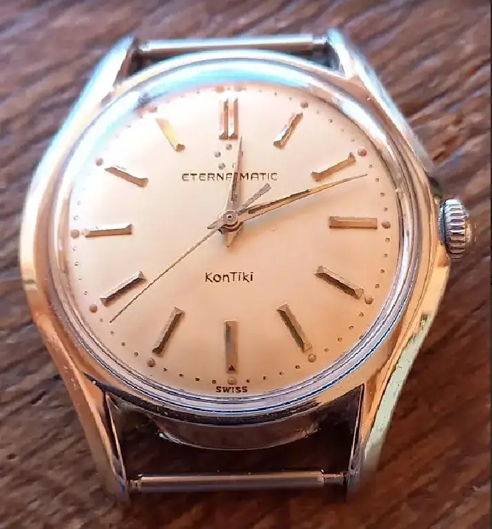 EL ETERNA KONTIKI es de la primera serie de este reloj emblemático y lleva el primer calibre con rodamiento por el rotor y una regulación fina de la raqueta del volante. La caja es de acero con fondo de rosca y el único Kontiki que no lleva el sello de oro en el fondo.