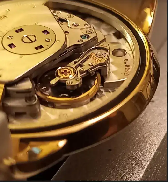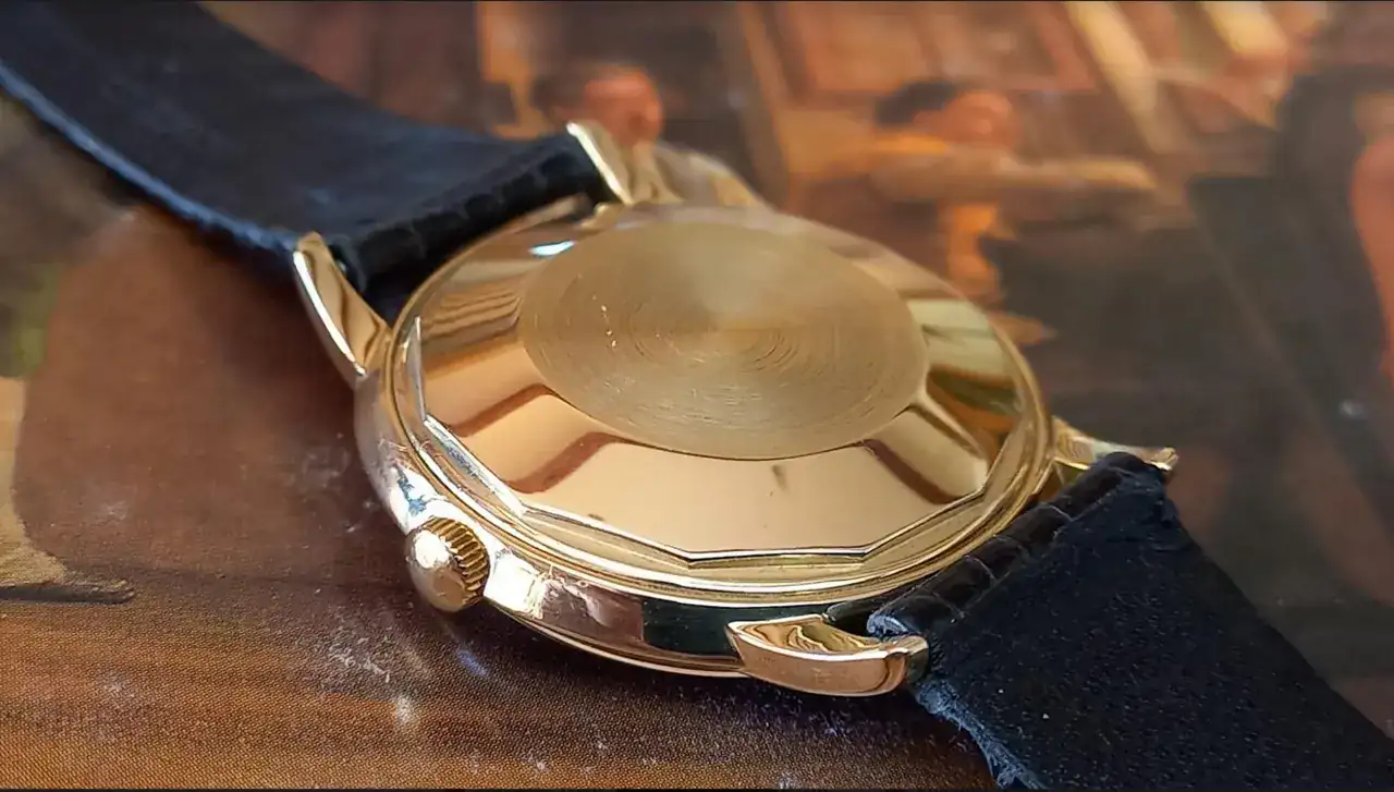 El volante con espiral plana, regulado con raqueta y cuello de cisne. La caja es de acero con bisel en oro rojo y las asas están cubiertas con una capa de oro rojo también. Una versión bastante rara. El fondo de acero es de rosca.