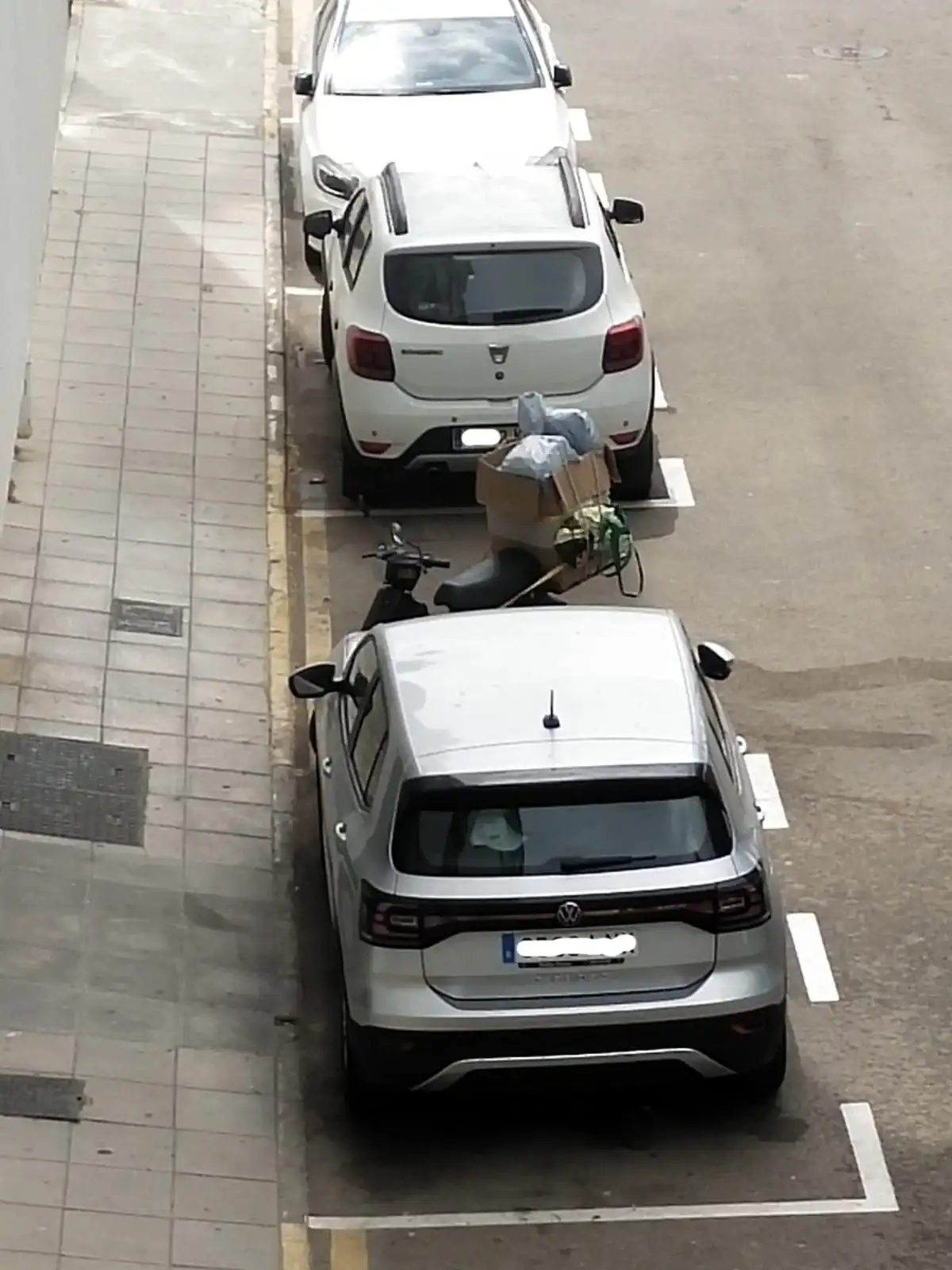 La imagen es casi dantesca, los paquetes en una caja de carton medio deshecha, todo amarrado con un pulpo y como accesorio una bolsa de rafia del mercadona. Y dejado ahí de la mano dedios. No lo puedo asegurar, pero intuyo que un barrio mas abajo se llevaron la caja de cartón con la moto incluida. Porque eso, en según que sitios es , desgraciadamente, poco menos que provocar.