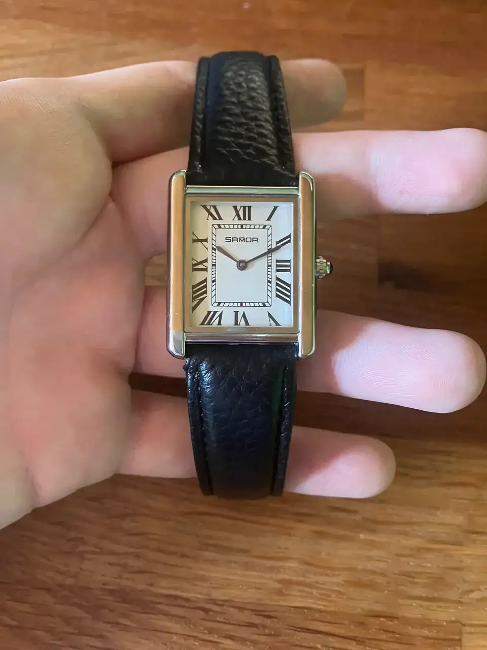 Centrándonos en el reloj, es un cuarzo rectangular con números romanos bastante familiar, vete a saber por qué, de la respetada y prestigiosa marca china "Sanda". Viene con una correa de "genuine leather" que al tacto da el pego aunque no es que sea la panacea (nuevamente repito, "por 10€ no nos podemos quejar"). El cierre de la correa es una copia de su equivalente de lujo, para mí bastante incómodo.