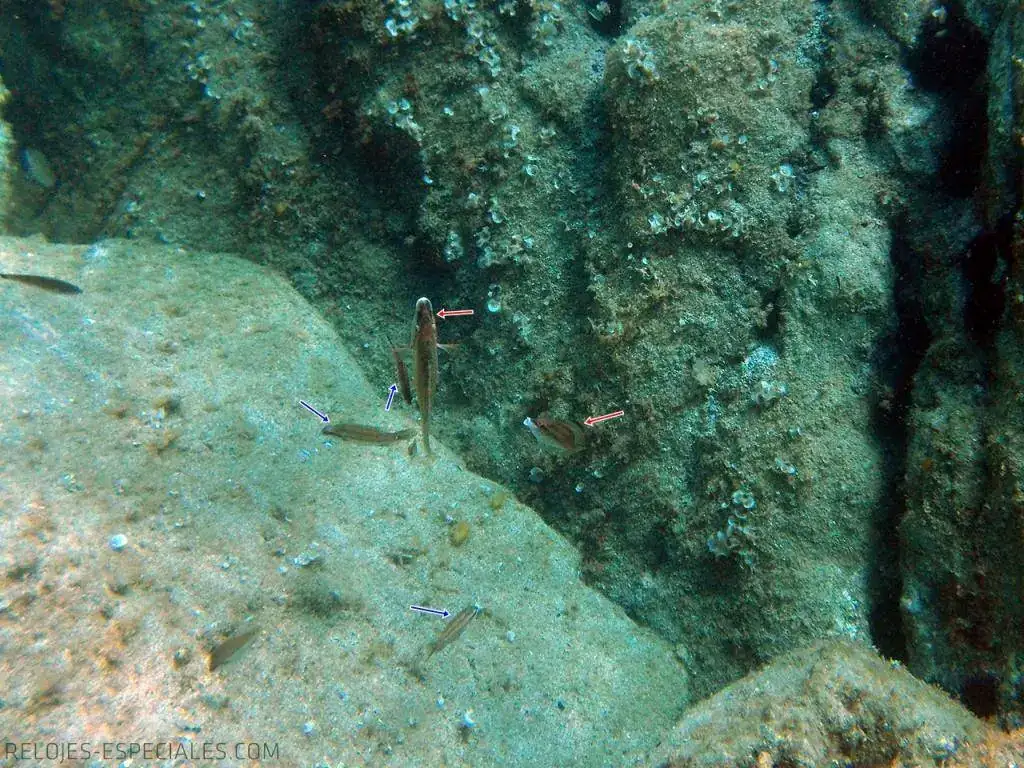 Los peces señalados con una flecha azul son los limpiadores, que se comen los parásitos en la piel de los señalados con flecha roja: el de la izquierda, que está en posición vertical, indica que está preparado para el inicio de sesión, mientras que el de la derecha -con la dorsal levantada- espera su turno.