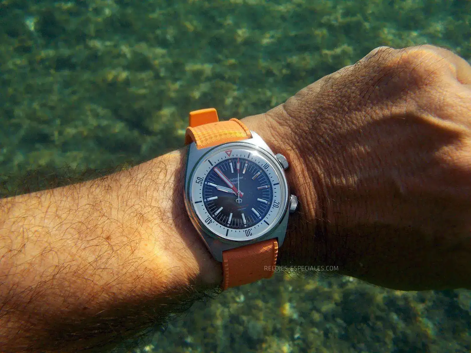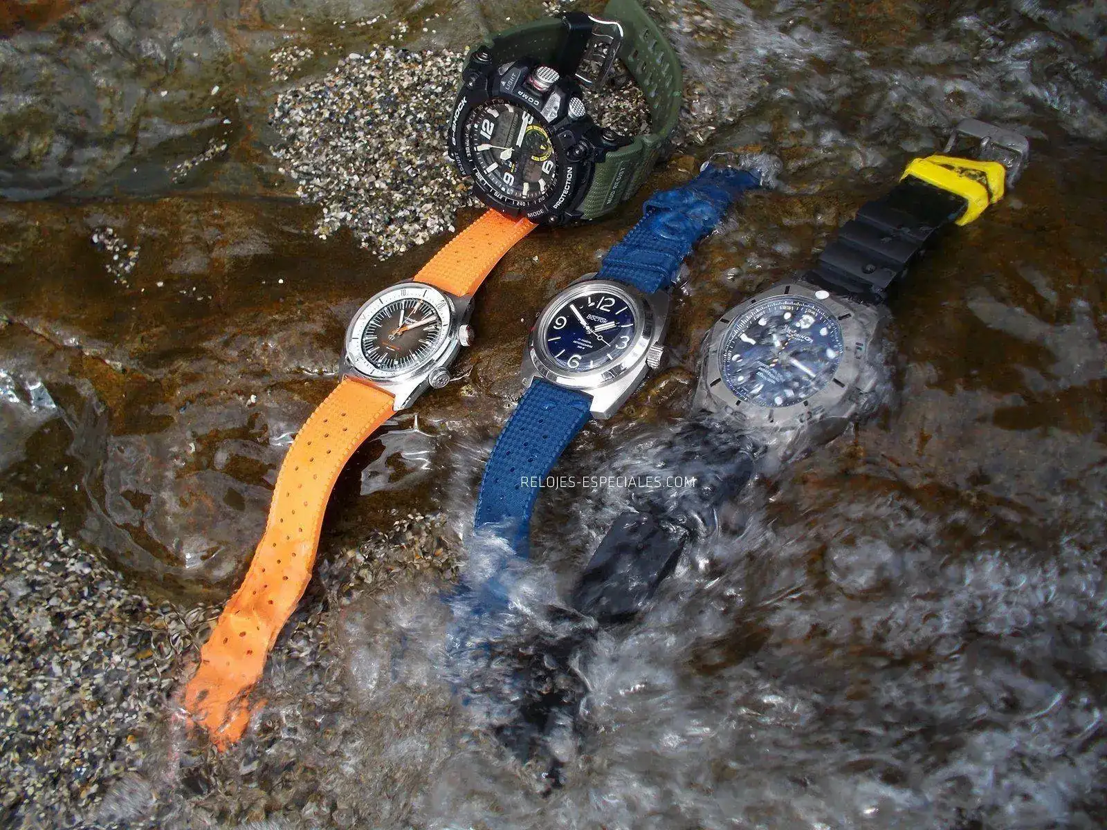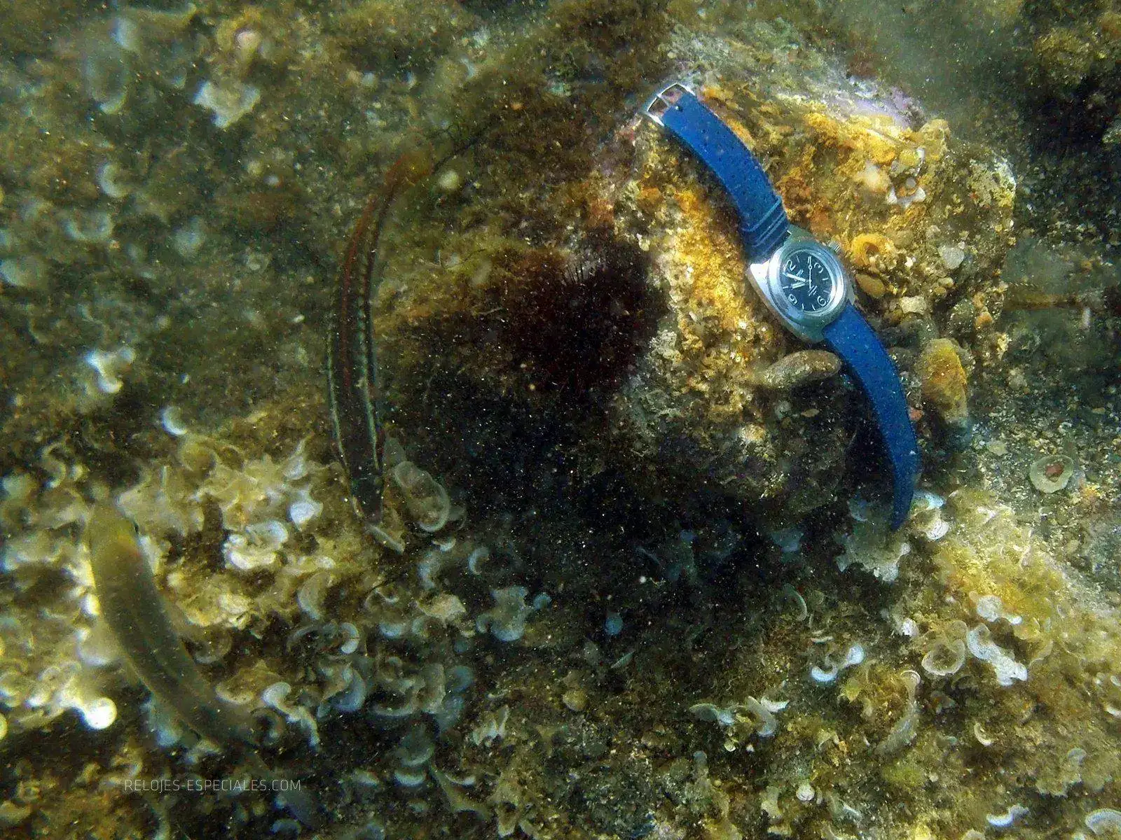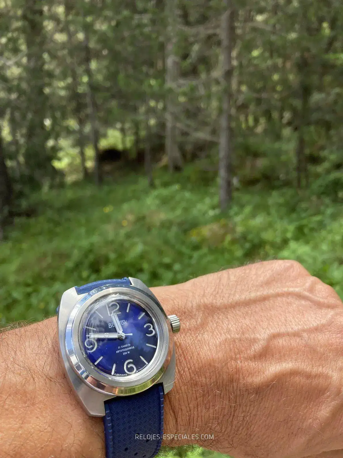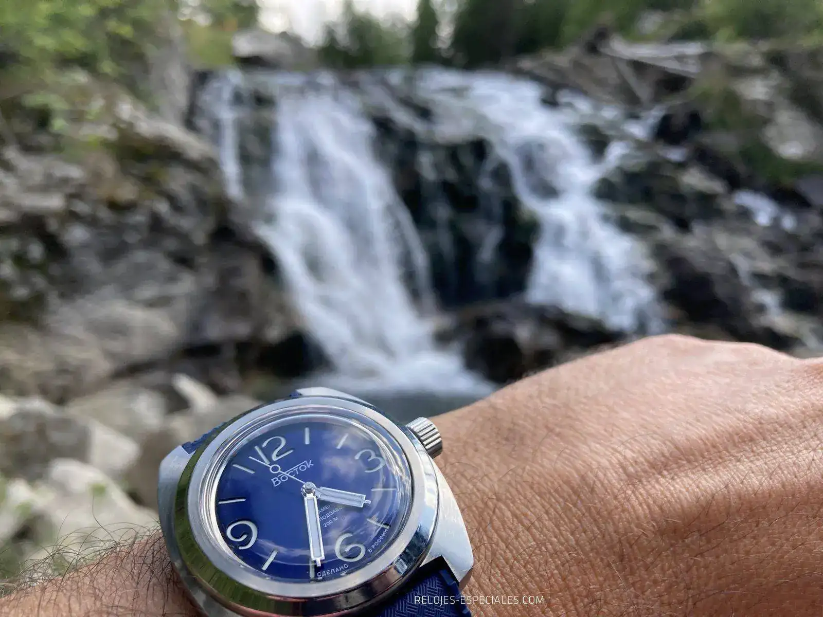 Empezando por el principio, este año también hubo montaña, a donde me llevé una adquisición que ha superado mi expectativas. El llamado PAMphibia de Boctock es un reloj sin ninguna pretensión que da un resultado muy superior a su precio. Como la gran mayoría de rusos, cabe añadir. Me gustaron sus índices, pero especialmente su esfera azul. La "Tropic de los chinos" que le calcé parece hecha expresamente para él. Por cierto, y confirmando lo comentado en el hilo de @cibetris, el Christopher Ward que veréis más adelante también usa una "tropic" de esas (menos de 8 euros antes de iva, envío gratuito). En realidad dos, que le compré también una marrón.