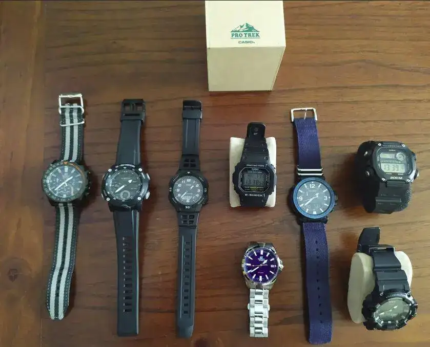 ¡¡¡Helos aquí!! He incluido la caja del Pro-Trek porque me pareció curiosa: es de madera y es de las cajas de Casio más curradas, junto con las de los Edifice. Con los relojes más normalitos las cajas son de plasticucho.