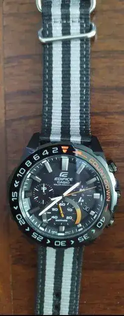El de los pantalones a rayas es un Casio Edifice. Es bastante modernillo, con ese toque naranja, bisel giratorio de cuenta atrás y solar powered (vamos, que le va el rollo ecologista!). Según vi en algún foro o página web (después de comprarlo) el diseño tenía que ver con una escudería de motos o coches llamada Toro Rosso (según vi en los comentarios de la gigantesca tienda on-line donde lo adquirí, pero creo que no es así). Ni idea; ni los coches ni las motos ni las escuderías me interesan los más mínimo.