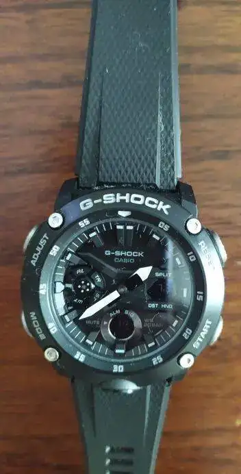 A continuación un G-Shock GA-20001A9ER pero la versión seriecieta. Todo en negro; salió hace un par de años con una versión amarilla y negra, otra azul y negra y esta que la vi hace poco y me lancé porque me pareció menos cantoso que los otros (y más barato, todo hay que decirlo). Tiene varios usos horarios, cronómetro, cuenta atrás y varias alarmas. Además es resistente al agua (20 BAR; yo no aguanto tantos bares en una noche!) y a los golpes contra la pared. La caja dice ser Carbon Core Guard, que por lo visto es un invento de Casio para amortiguar golpetazos. Además, el botón de la luz está justo en la base (a las 6) y es fácil de localizar cuando te despiertas por la noche. Tiene dos pequeñas ventanas digitales para los segundos, la fecha, cronómetro y demás información. A pesar de lo que pensaba inicialmente se ve bastante bien. Por último, para indicar las funcionalidades, a las 9 tiene una rueda que va girando para indicar el modo seleccionado. A los nenes les encanta! A mí también.