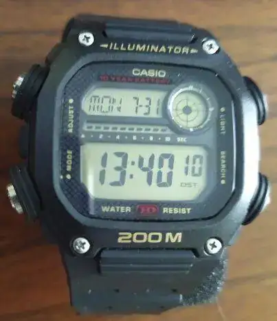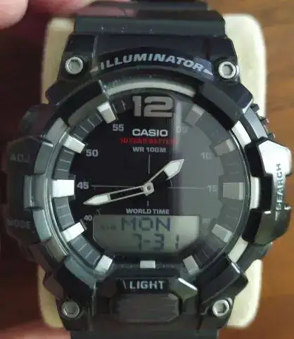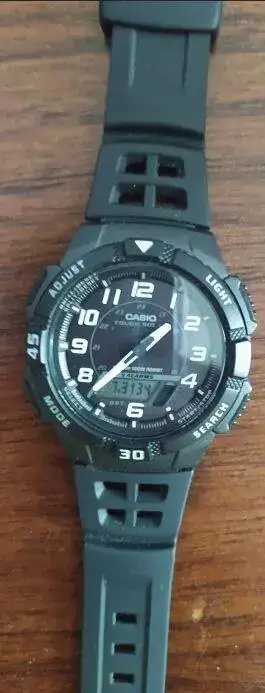 El siguiente es el modelo (AQ-S800W-1BVEF), se supone que tiene 42 mm. (eso dicen todos!) pero a mí se me hace pequeño. Tiene todo lo habitual (cronómetro, cuenta regresiva, alarmas,...) y es bastante ligerito. Además dice ser tough solar; lo segundo, doy fe: cuando lo pongo boca abajo se apaga la pantalla y se paran las agujas. Al voltearlo y volver a darle la luz se recupera en unos segundo. Lo primero (tough), no puedo asegurarlo: aún no lo he tirado contra la pared. El bisel dice ser de un material llamado Kunstsoff. Deber ser plasticucho en algún idioma que desconozco. Miraré el diccionario Chiquitistaní-Español. Español-Chiquitistaní, que tanto usaba en mis intercambios epistolares con el Gran Chiquito de la Calzada).