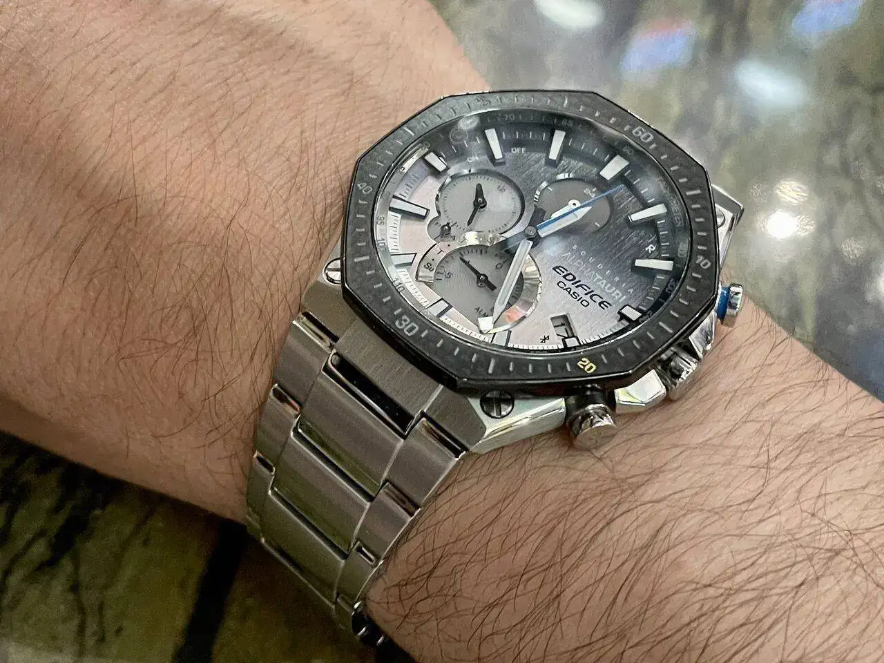 Y otro Edifice (EFV-100D-2AVUE); este medio elegantón pero con un toquecillo moderno y sencillote. Ideal para cuando llevas jersey y camisa y no quieres uno que llame mucho la atención. Bastante asequible, además. La parte pulida es un imán de huellas, eso sí!