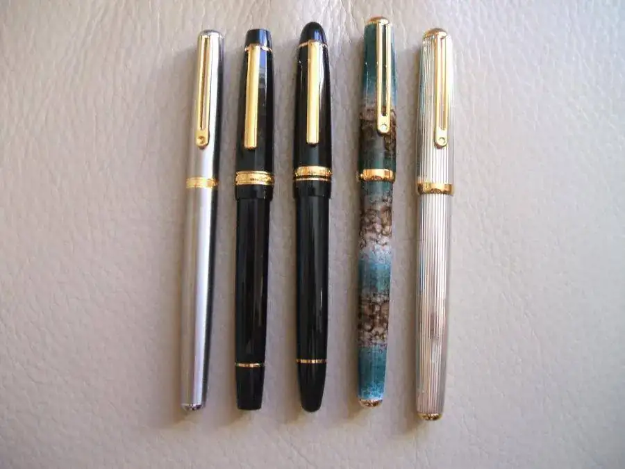 Como ni mi cámara es lo suficientemente decente, ni yo lo bastante hábil, las imágenes poco dicen. No obstante, creo que se intuyen, de izquierda a derecha; una Wall Street; una (hummm) Corinthian; mi Caravel (Qué presentación y qué plumín más bello); y las Sirocco, Marble Green y Plat con plumín de oro (veremos qué tal va). En la segunda fotografía las he puesto en topless, en el mismo orden. Y en la tercera, no creo que se aprecie, plumín y capuchón ya grabado con mi nombre y apellido