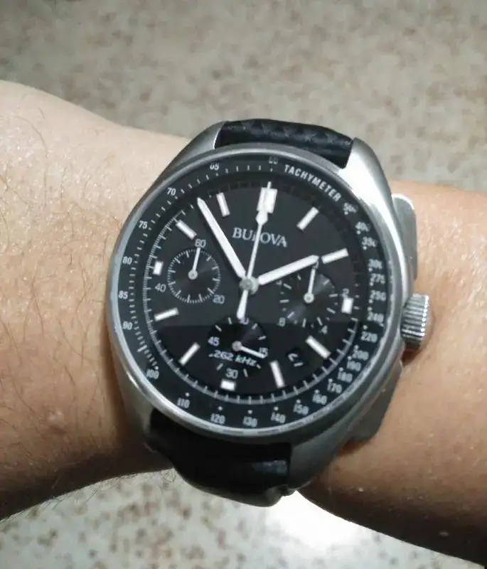 Hace meses viendo un reportaje en un diario digital, vi el Bulova MoonWatch...y leñes...me enamoro, lo primero que me paraba un poco eran sus 44mm, yo mas de 42...como que no. Por eso cuando lo compré estaba pensando que igual al tenerlo puesto no me sentaría bién...pero que decir, todo lo contrario...no se notan para nada sus medidas...queda "niquelado" en mi muñeca, destacaría su visibilidad al tener el fondo negro y las agujas blancas...se ve la información fácil y clara.