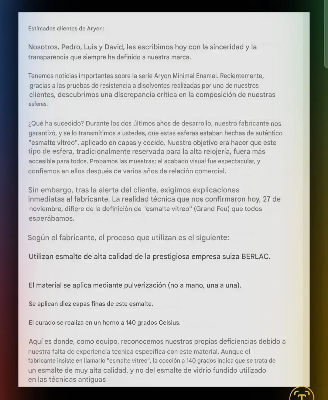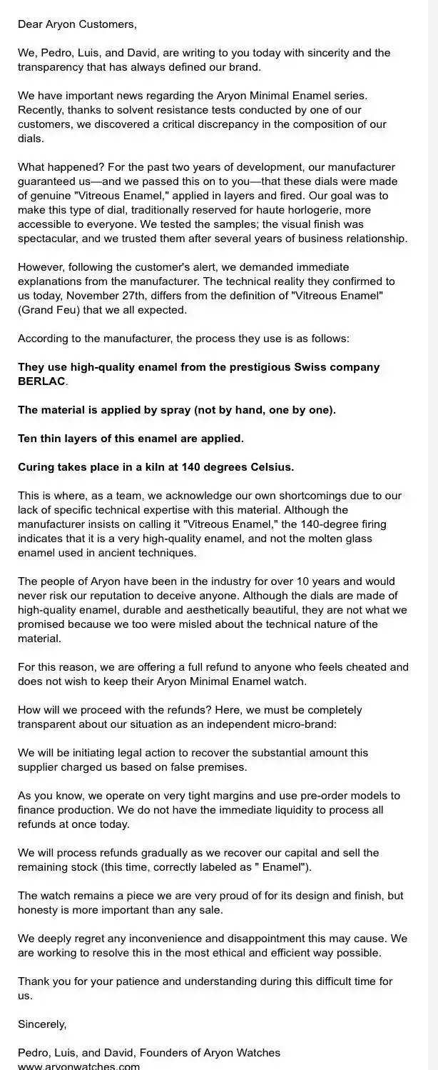 Ya tuvimos el guilloché-gate de Atelier Wen con sus guilloché con horas exageradas y 3 maestros en vez de uno y sin control de profundidad que es la gracia de la técnica, y ahora el enamel-gate de Ayron y su spray de enamel de calidad. Ya os traeré en el futuro el beveling-gate o el handengraving-gate o vete a saber pero me da que no es la última