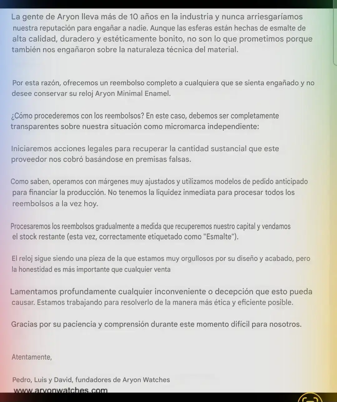 Me alegro mucho de que devuelvan el dinero a la gente pero yo tras ver este despropósito ya no confiaré en esta marca