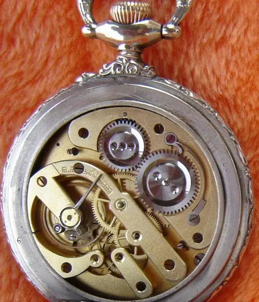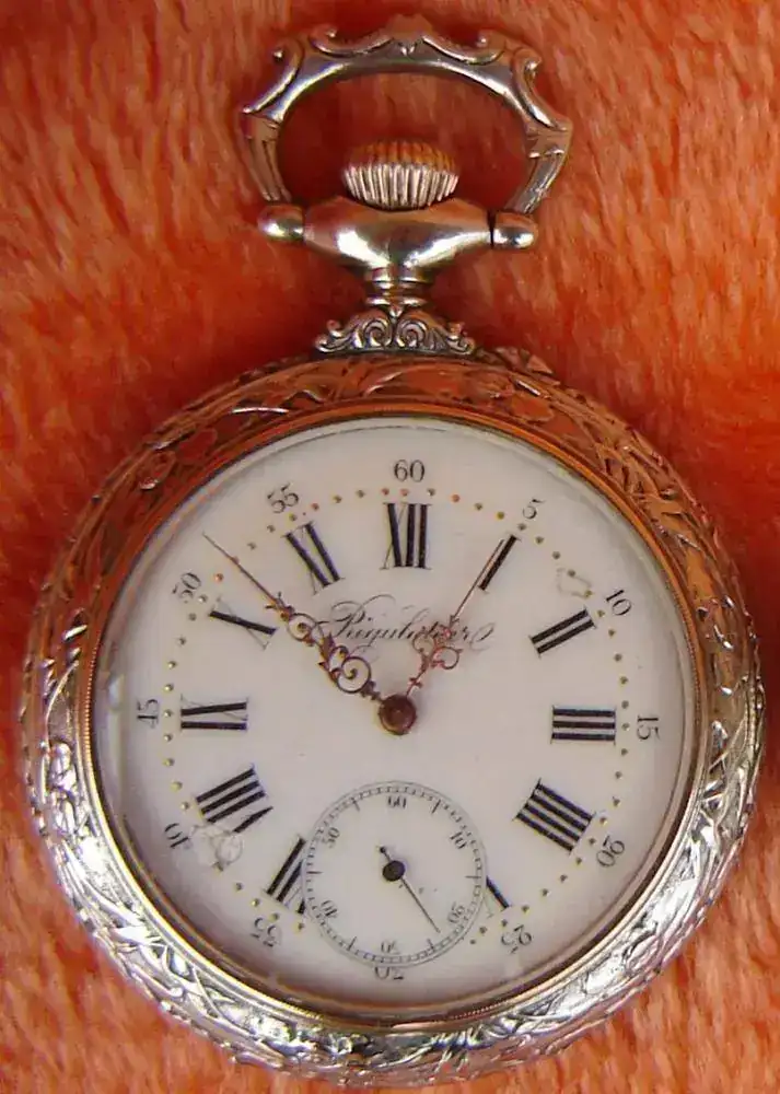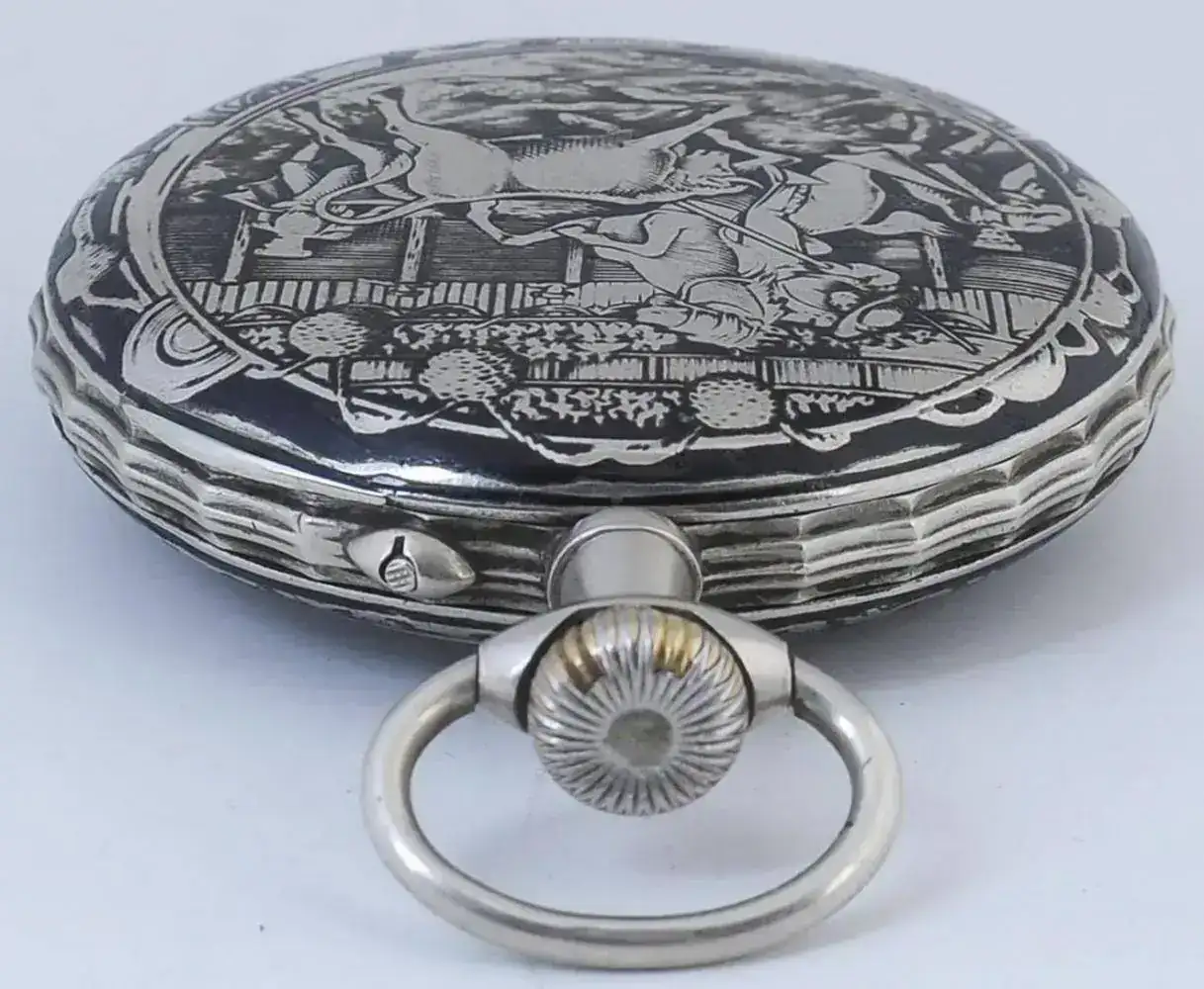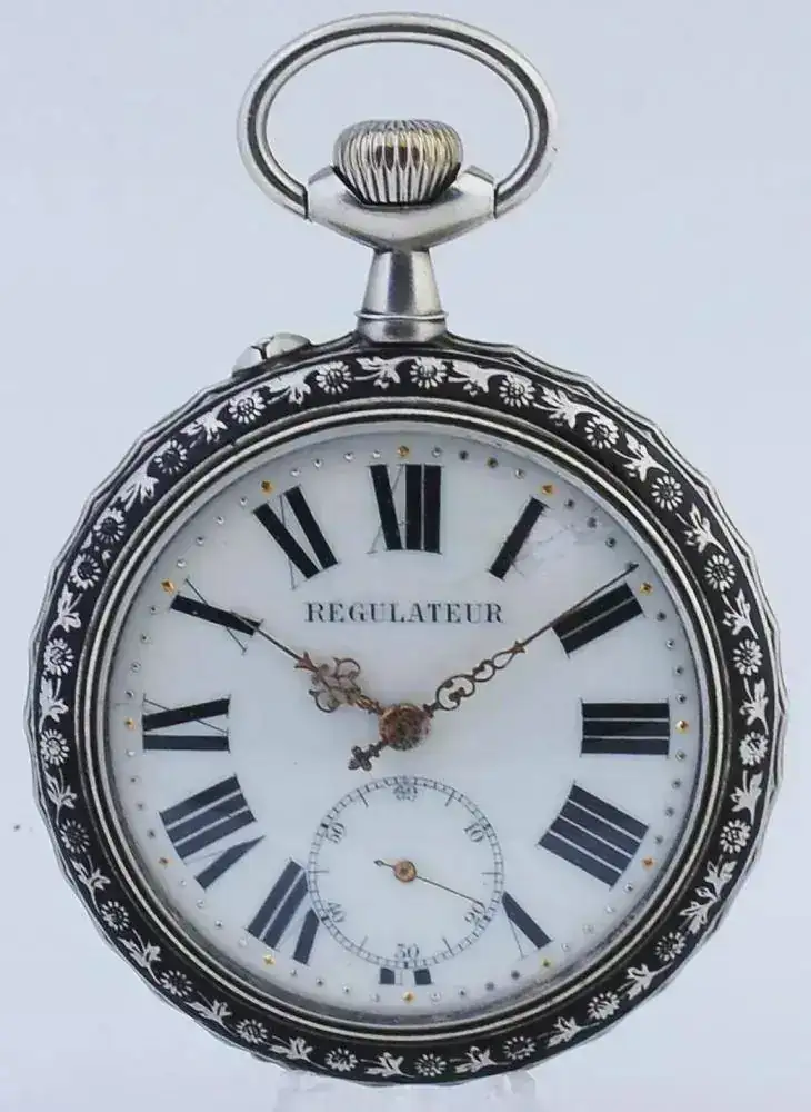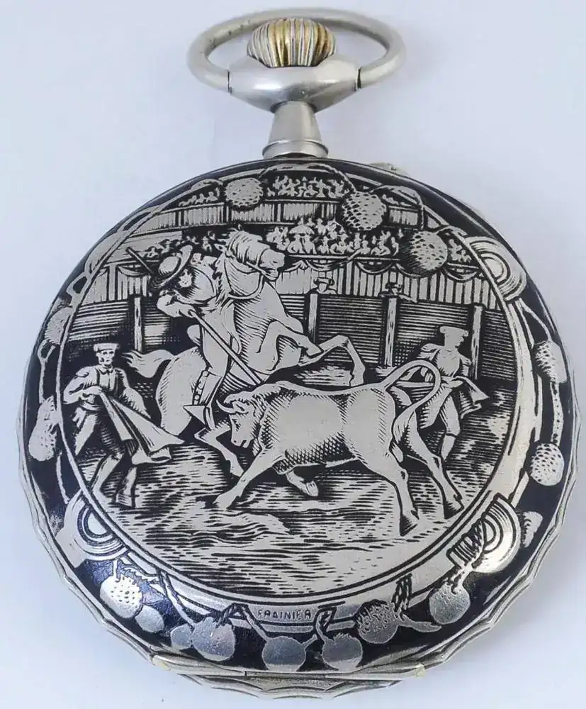Reloj denominado “REGULATEUR”. Reloj de gran diámetro 67mm, finales del siglo XIX. Con caja en plata nielada, con escena que representa el lance de varas de una corrida taurina.