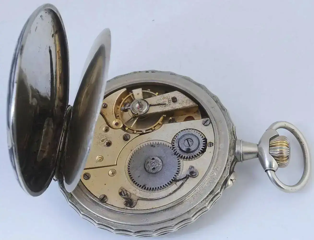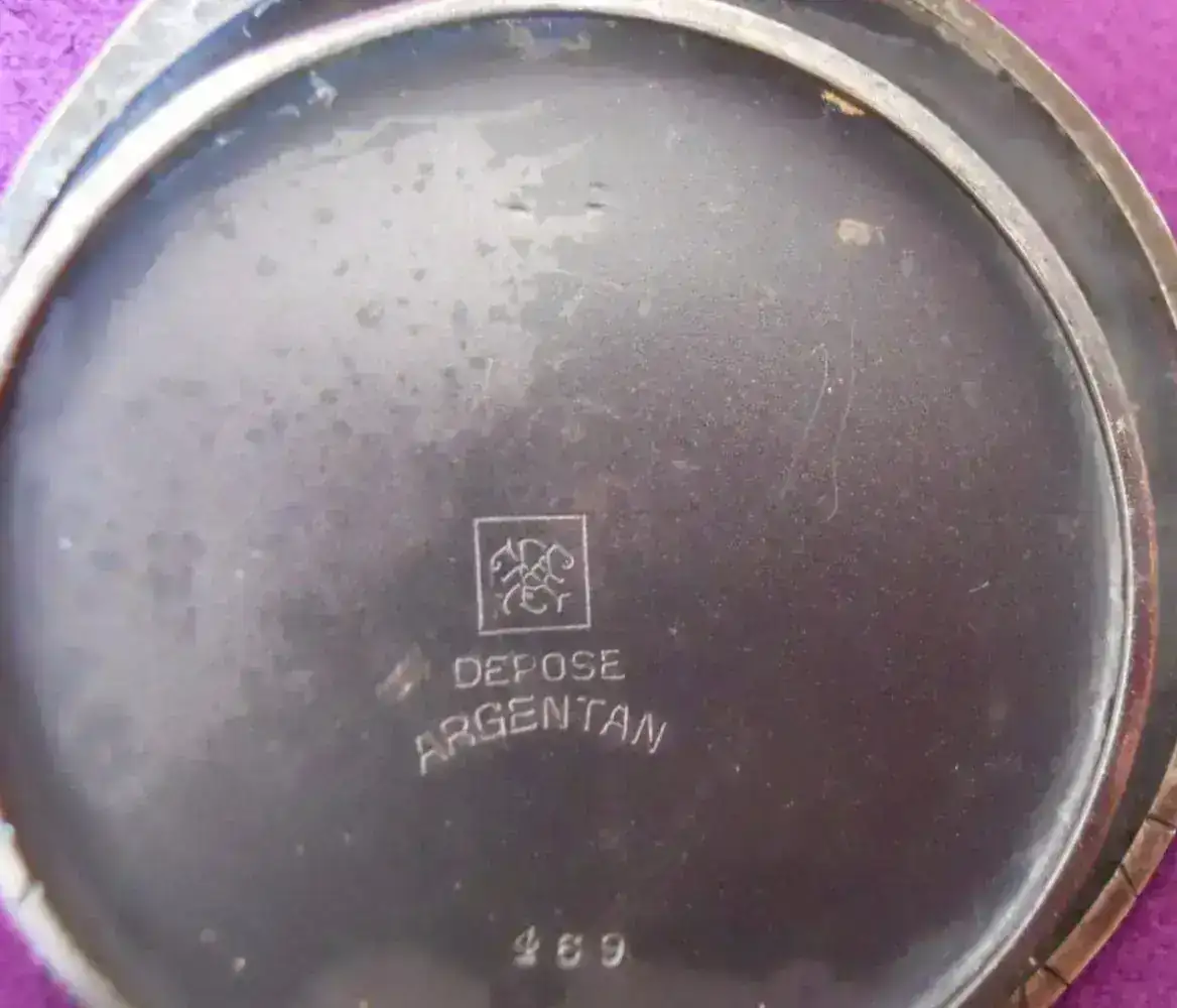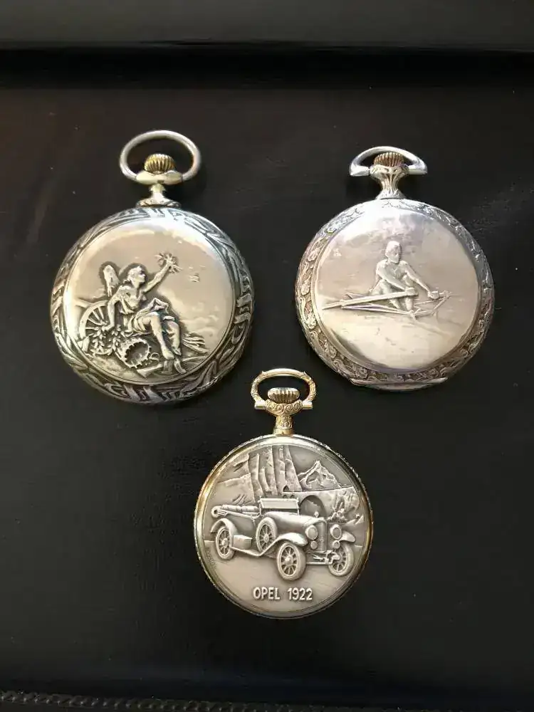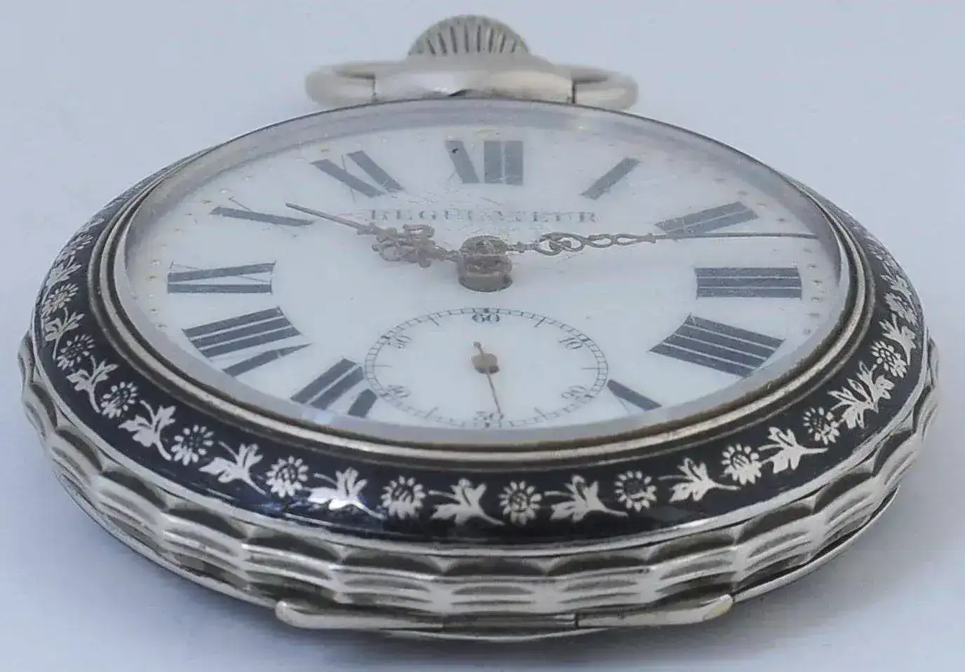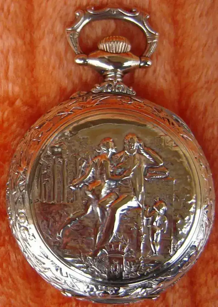 Reloj denominado “REGULATEUR”. Reloj de gran diámetro 67mm, finales del siglo XIX. Con caja en plata nielada, con escena que representa el lance de varas de una corrida taurina.