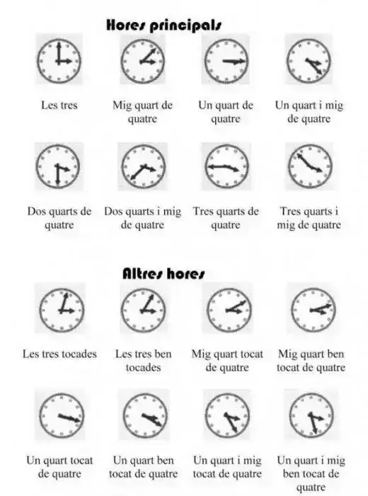 Bueno destrozar la lengüa tampoco. Hay muchas zonas en las que que no se usa i "quedarem a i mitja" es perfectamente correcto. Aquí hay un documento que lo explica muy bien:Desde que tengo uso de razón que digo las horas en catalán. Tengo que reconocer que hay mucha gente (de aquí y de allá, da igual) que no emplea esta forma tradicional de decir las horas y muchas veces ni te entienden. No soporto oir como destrozan la lengua diciendo: " quedem a i mitja (quedamos a y media) o cuando dicen: "arribarem a "menus" quart" (llegaremos a menos cuarto). De las pequeñas variaciones que hay, me gusta mucho la que sirve para decir una hora pero sin precisar. Por ejemplo, cuando te preguntan a qué hora has llegado (de salir de fiesta; de una reunión; del cine....) y contestas: " a les tres tocades" (a las tres tocadas), pues das una respuesta que tanto pueden ser las 3 y 10 como las 4 menos cuarto. Ah! en Andorra también se utiliza el "sistema horari català". Un saludo!!!